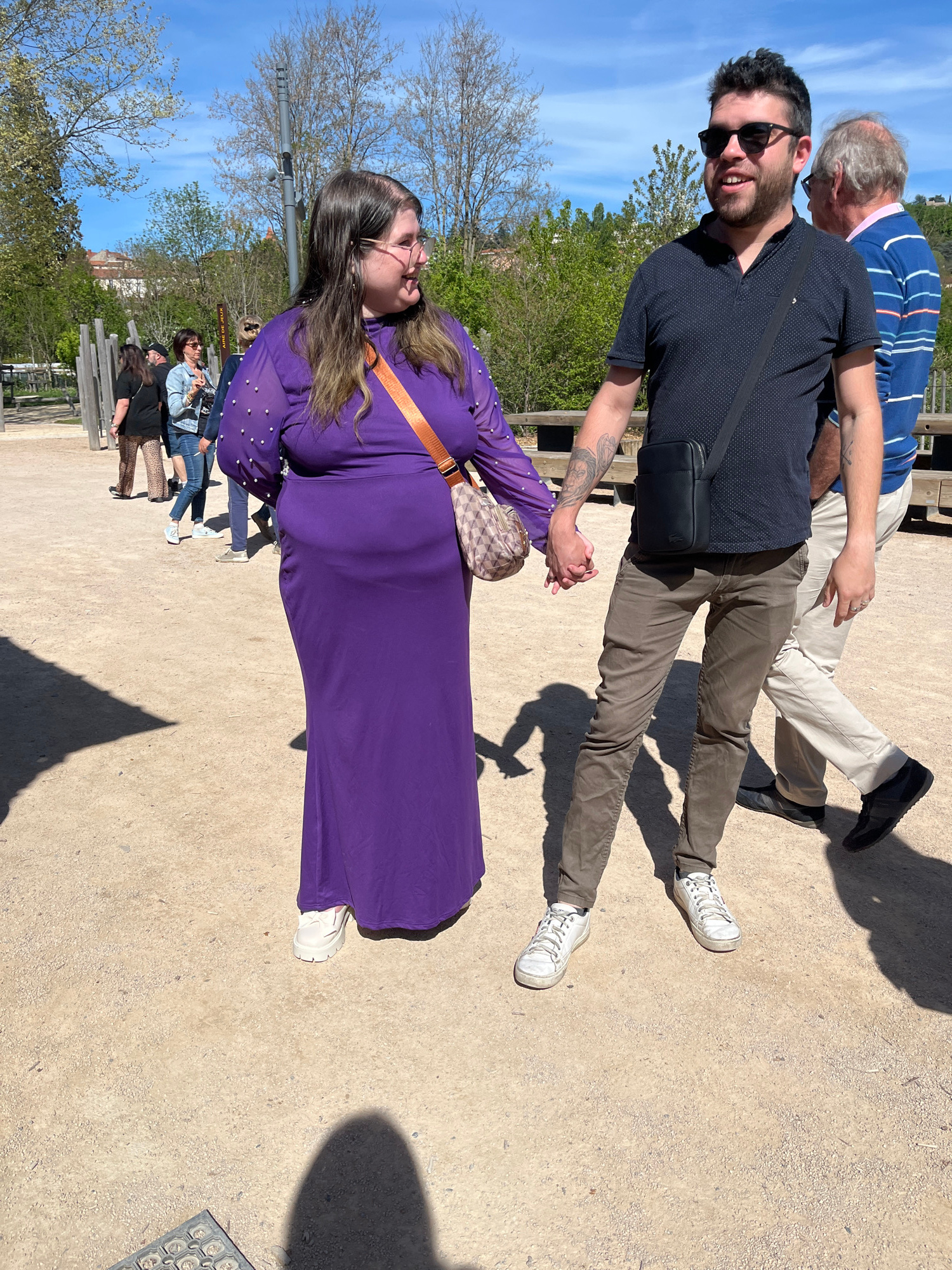 Three people are standing on a gravel path on a sunny day in Saint-Just-Saint-Rambert, France. A woman in a long-sleeved purple dress with pearl embellishments and white sneakers is holding hands with…read more