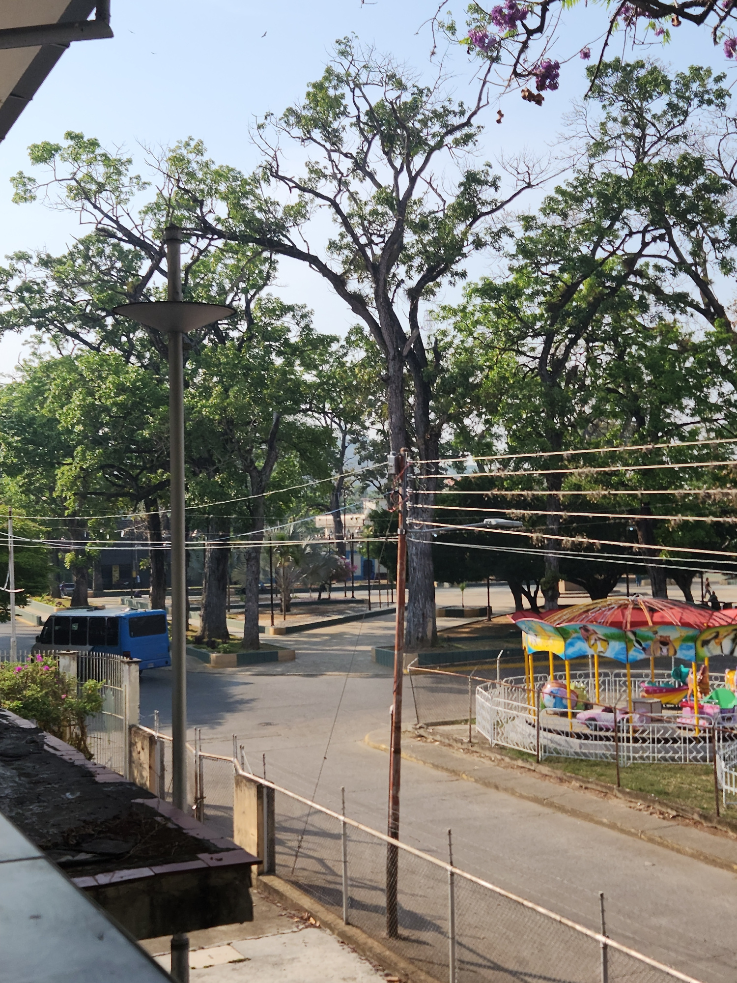 The image depicts a street scene in Tinaquillo, Venezuela. Trees with lush green foliage line the street, interspersed with utility poles and power lines. A blue truck is parked on the side of the roa…read more