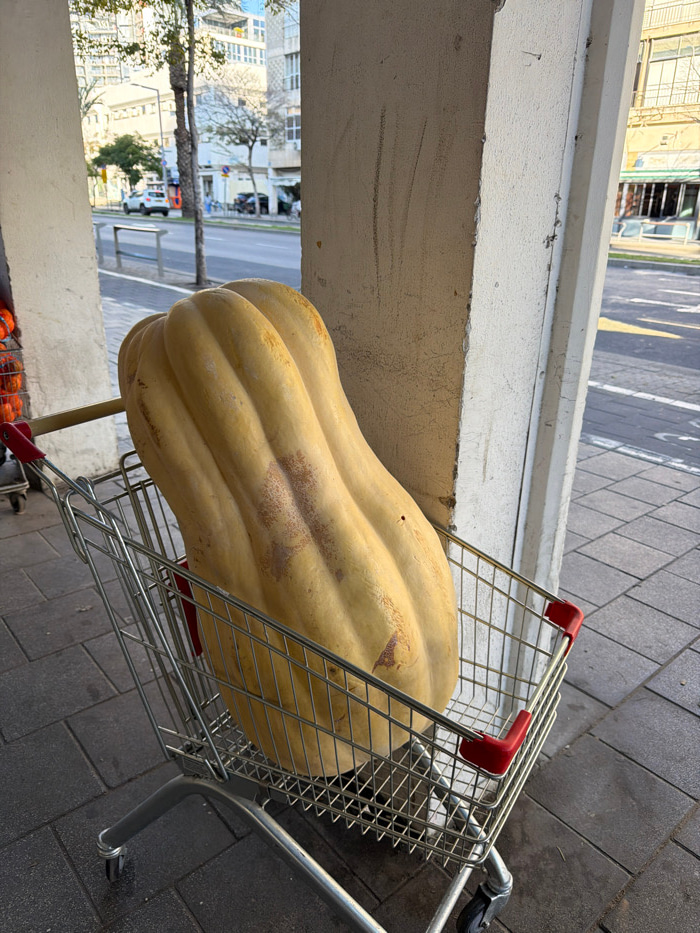 A large, elongated, light yellow squash with prominent ribs and reddish-brown surface blemishes is positioned horizontally within a metal shopping cart. The shopping cart, featuring red plastic accentβ¦read more