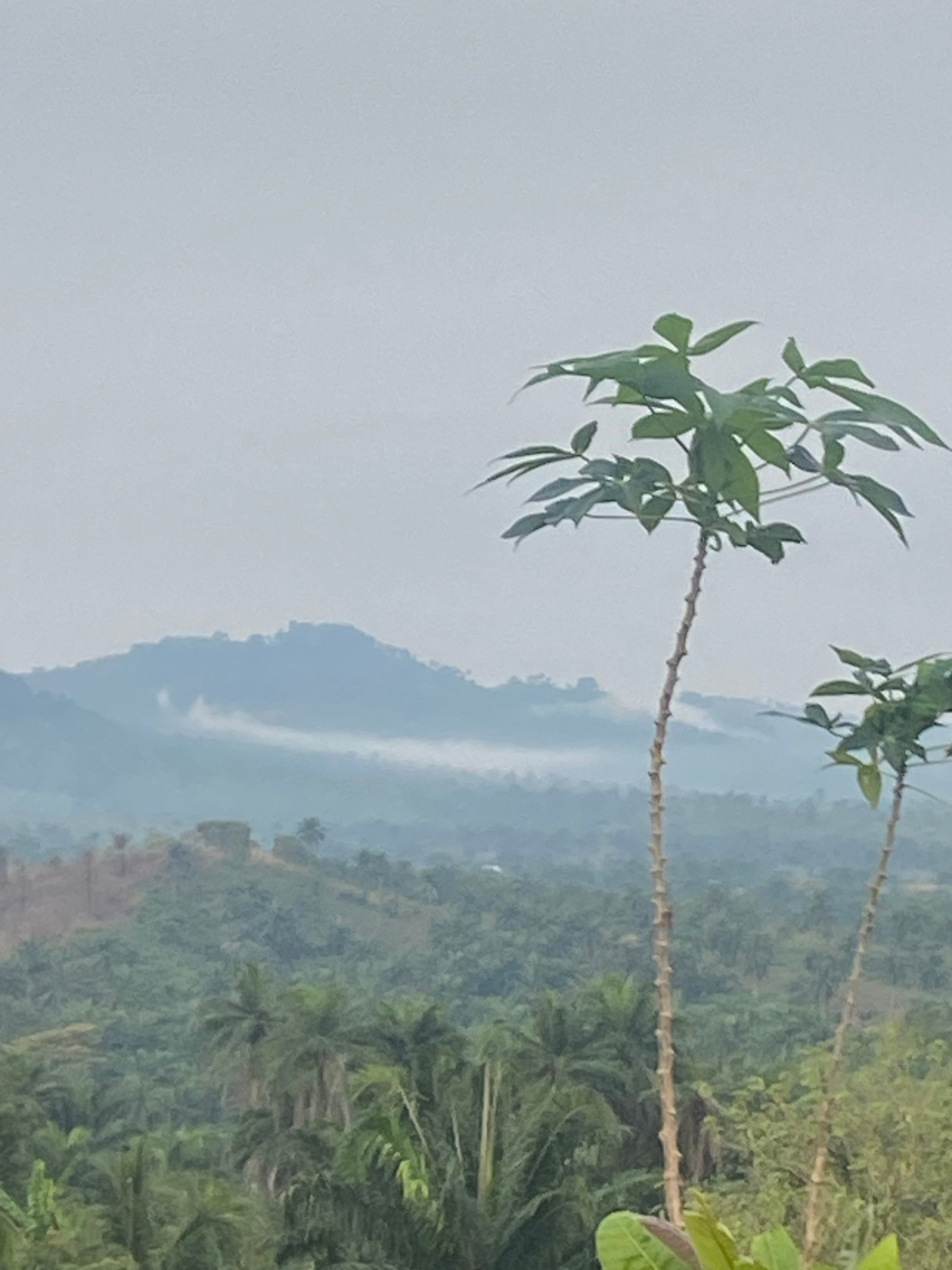 The image depicts a landscape in Achara, Nigeria. In the foreground, two cassava plants are visible. The background features a mountain range shrouded in haze or fog. The vegetation appears dense and…read more