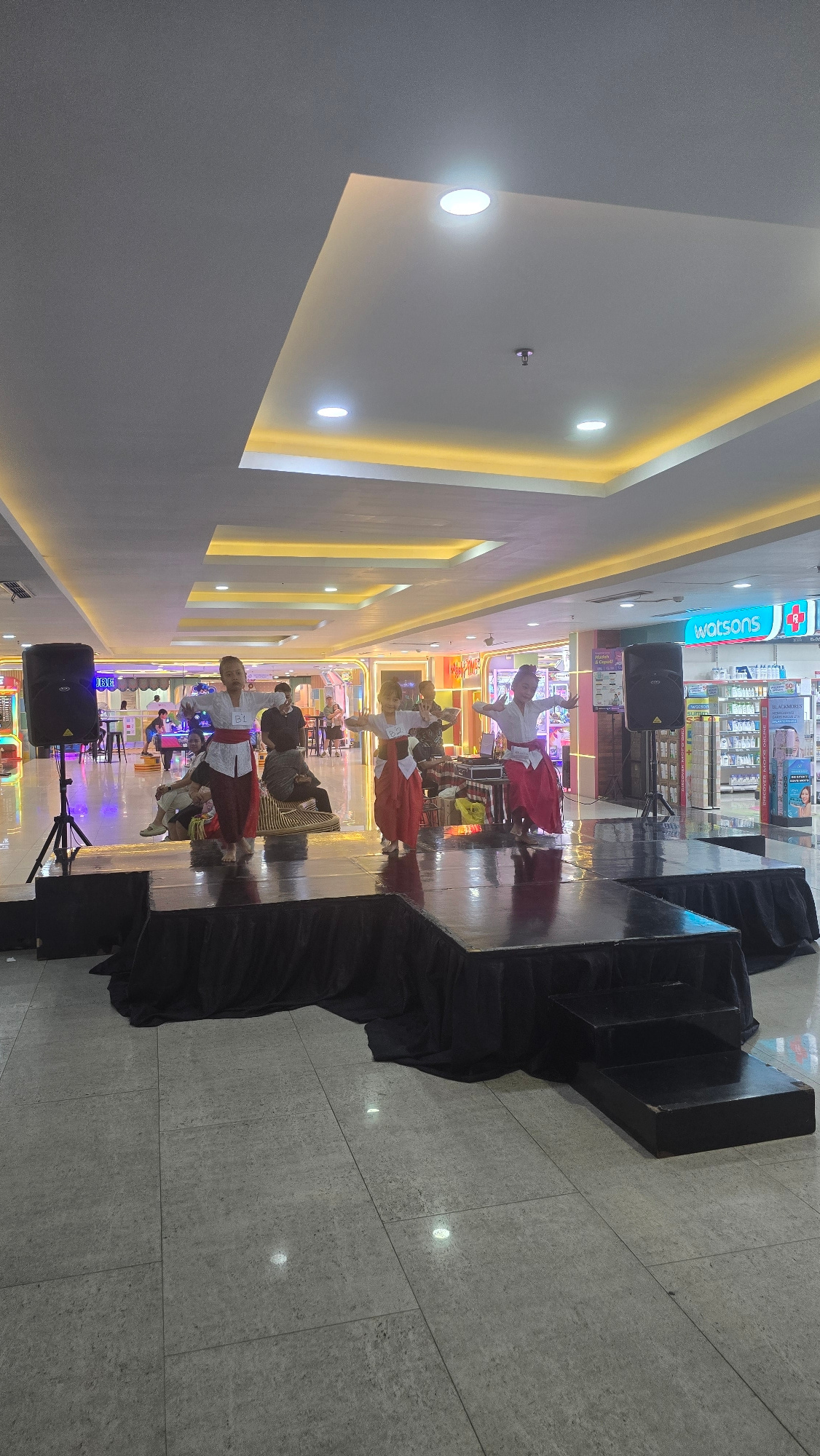 The image depicts a cultural dance performance within a shopping mall in Denpasar, Indonesia. Several young dancers wearing traditional attire, including red skirts and white tops with sashes, are per…read more