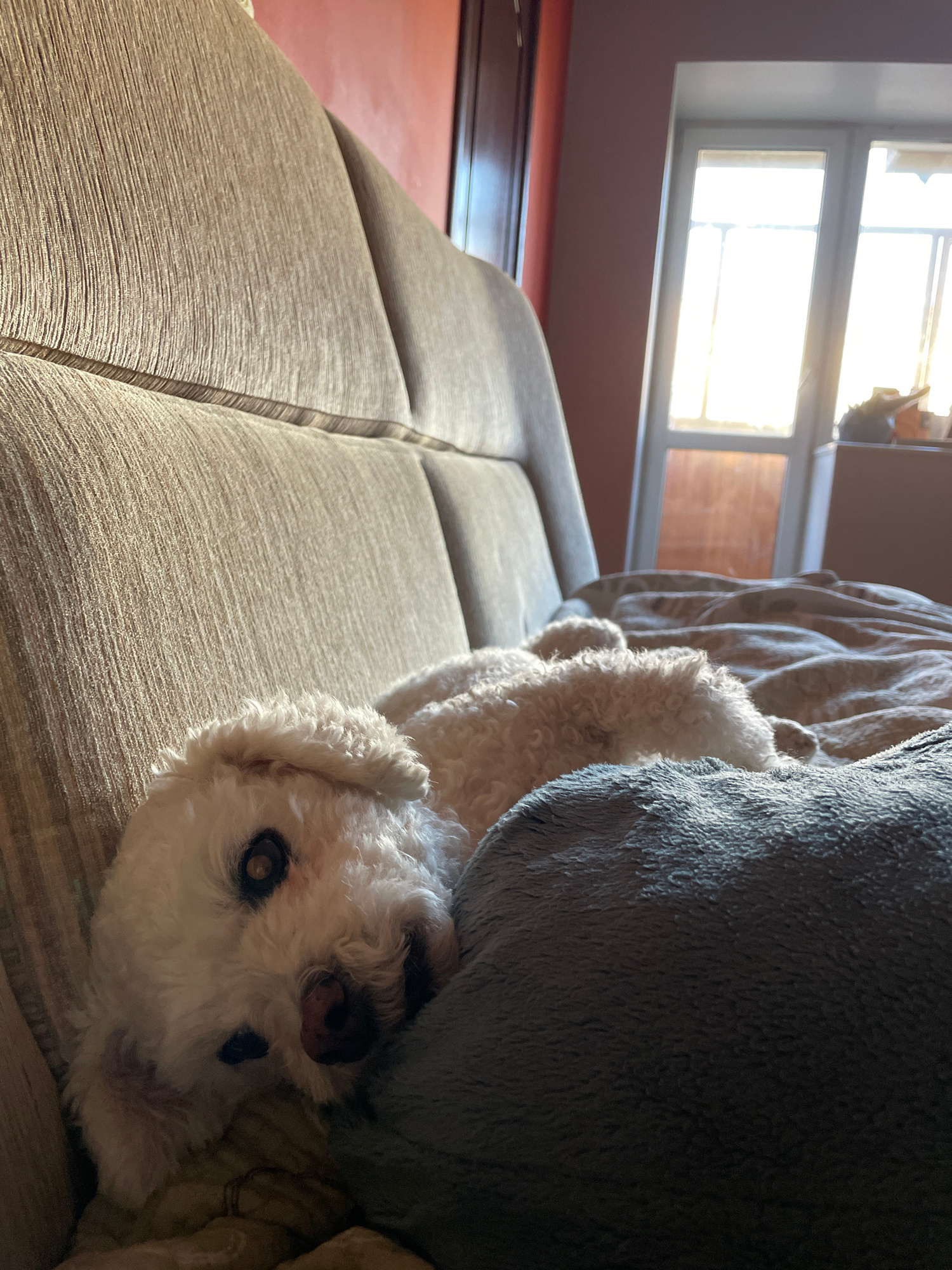 A white poodle dog is laying upside down on a tan sofa, partially covered by a grey blanket. A window is visible in the background, with bright sunlight streaming through. The wall is a reddish-brown…read more