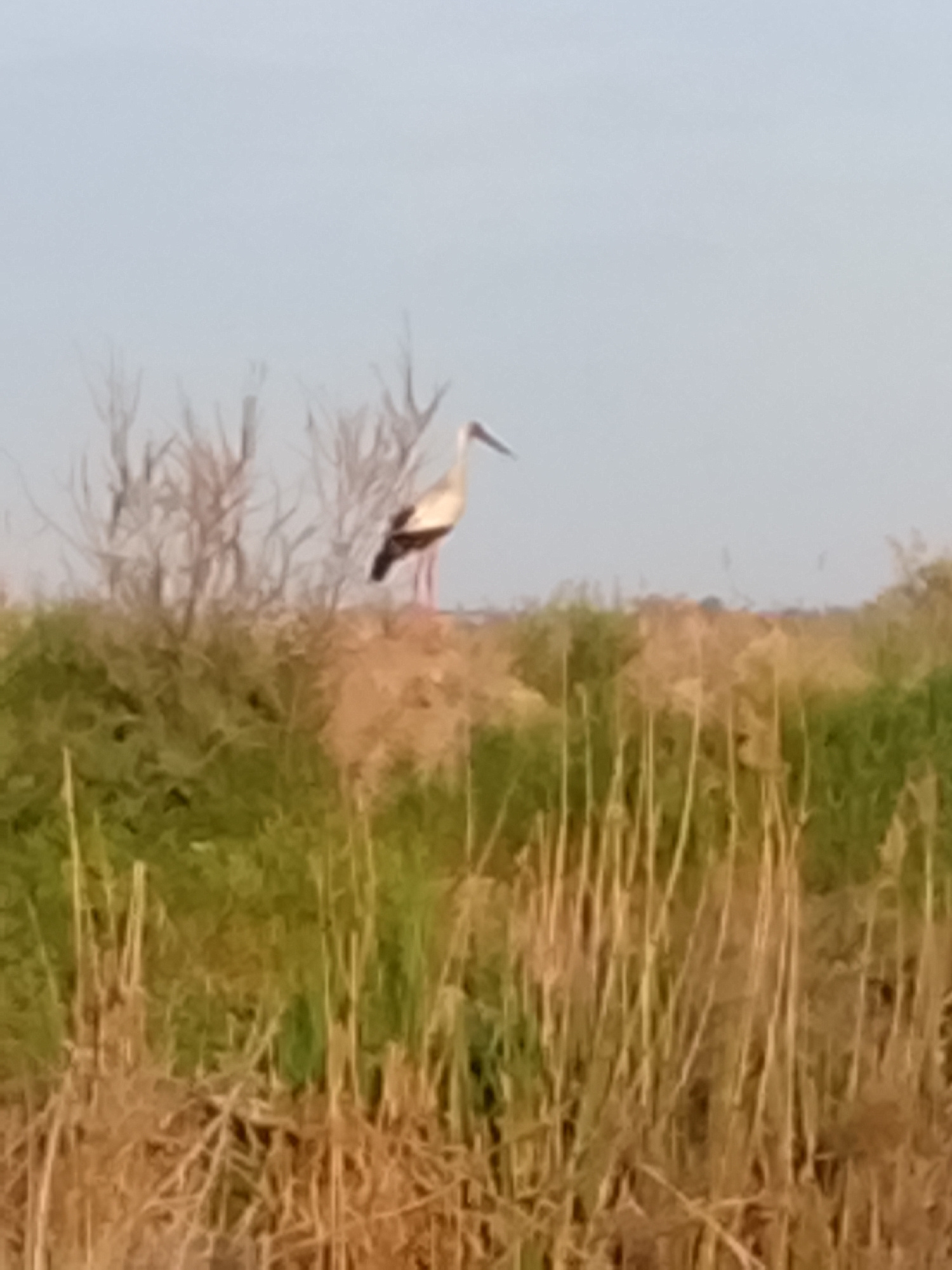 The image shows a stork standing on a grassy hill in Sabir Rakhimov, Uzbekistan. The foreground is filled with tall, dried grass, while the background features a clear sky and some sparse vegetation.…read more