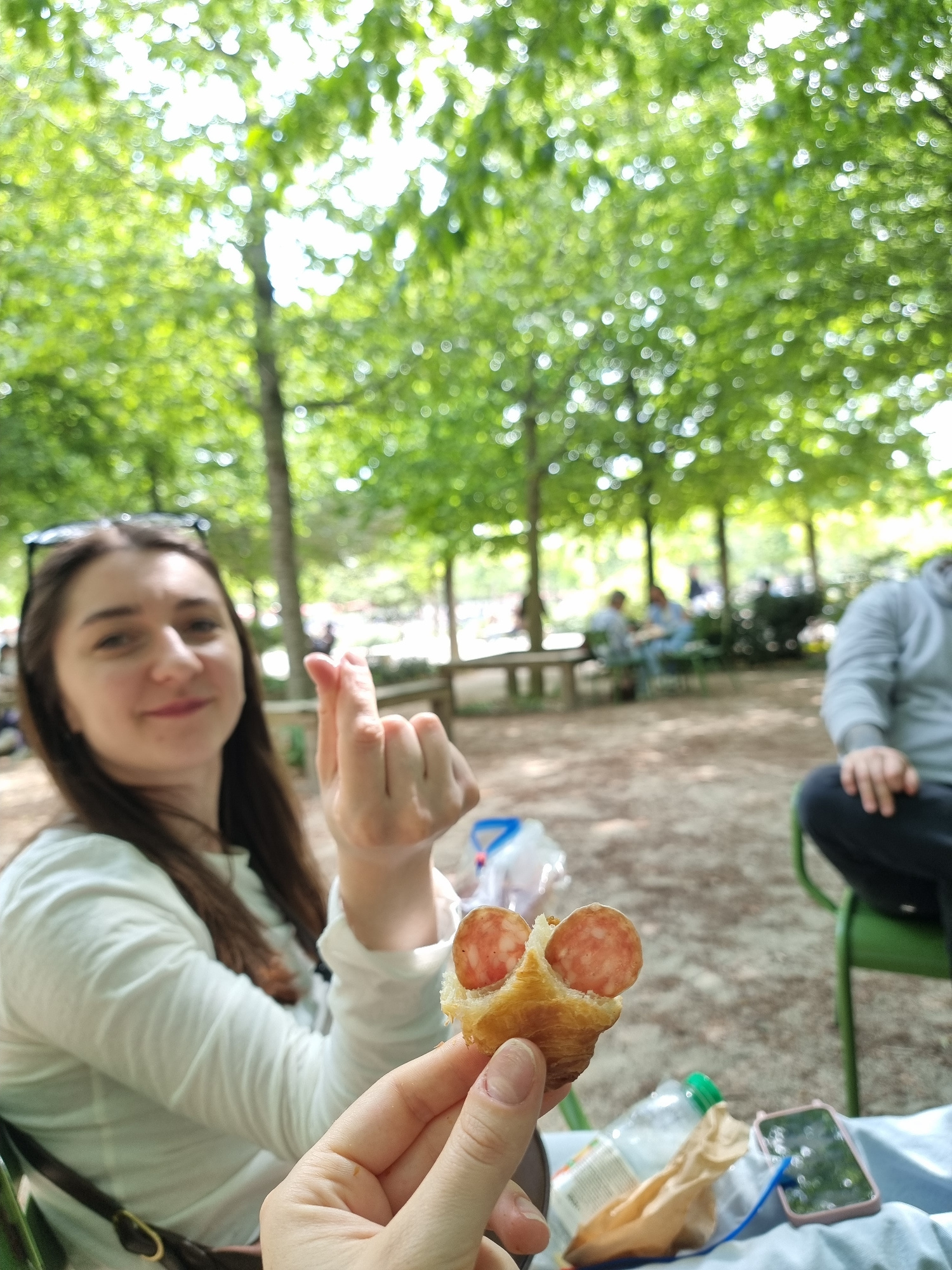 Here is a detailed description of the image: The image is taken outdoors, likely in a park setting, given the background of lush green trees, which appear as a bokeh effect in the upper left. A young…read more