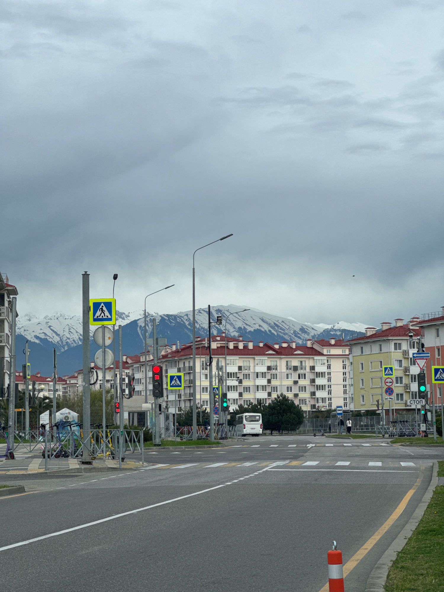 The image shows a street scene in the city of Sirius, Russia. A wide asphalt road occupies the right side of the frame, marked with white and yellow lines. A row of multi-story buildings lines the lefβ¦read more