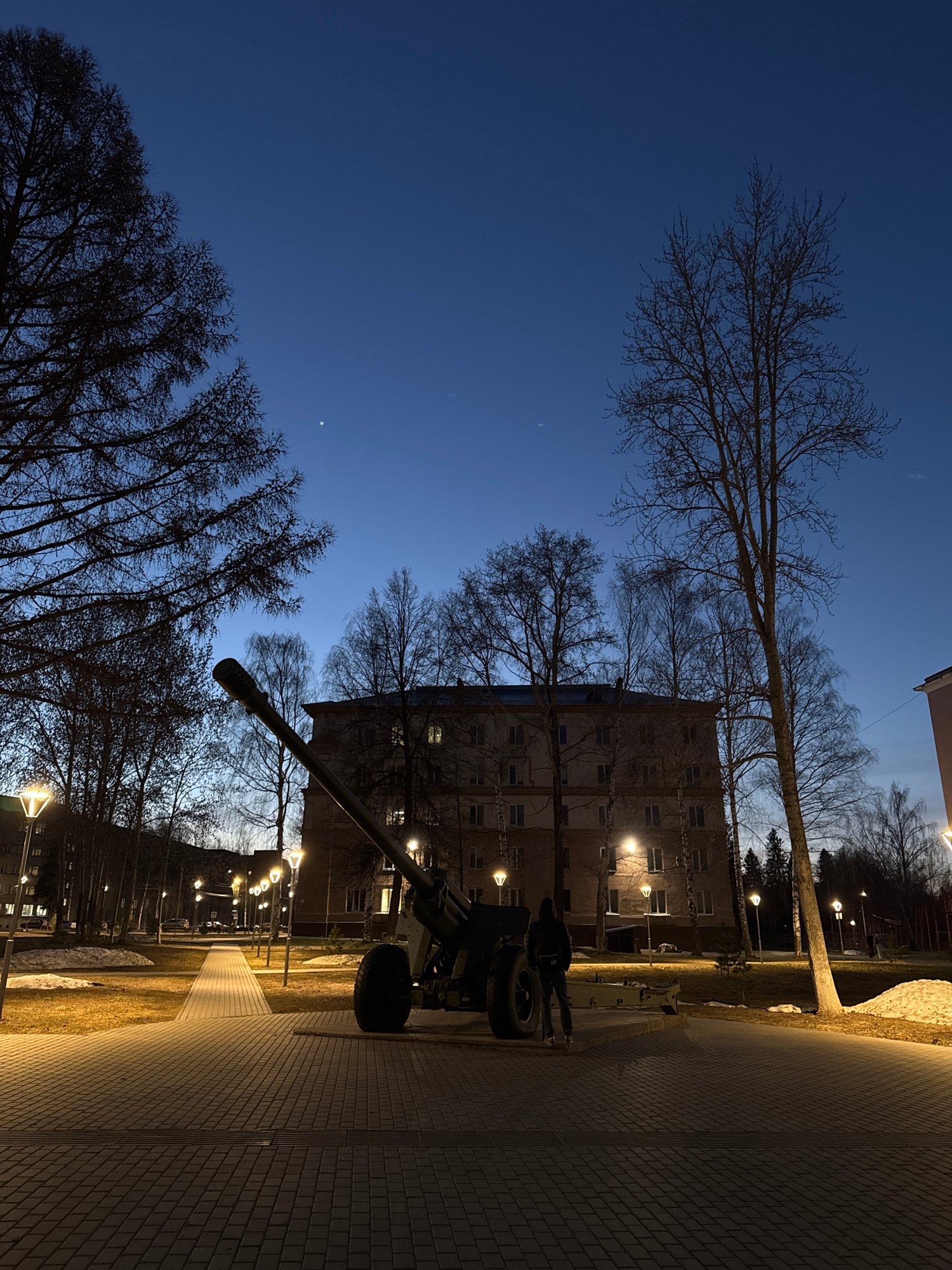 A ground-level, nighttime shot of an anti-tank gun memorial in Izhevsk, Russia. The monument, positioned to the right of frame, stands near a brick walkway illuminated by streetlights, against a backd…read more