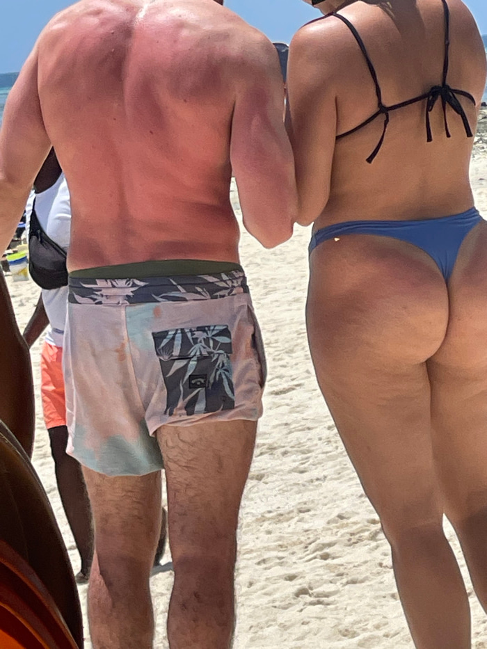 The image depicts a beach scene in Zanzibar, Tanzania, under bright daylight. In the foreground, two individuals stand facing away from the camera on light-colored sand. On the left, a fair-skinned ma…read more