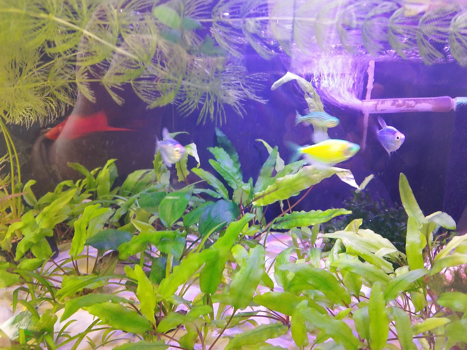 The image shows an aquarium with various fish and plants. There are at least four fish visible: one blue, one yellow, and two striped. A large dark object with a red fin is partially visible behind so…read more