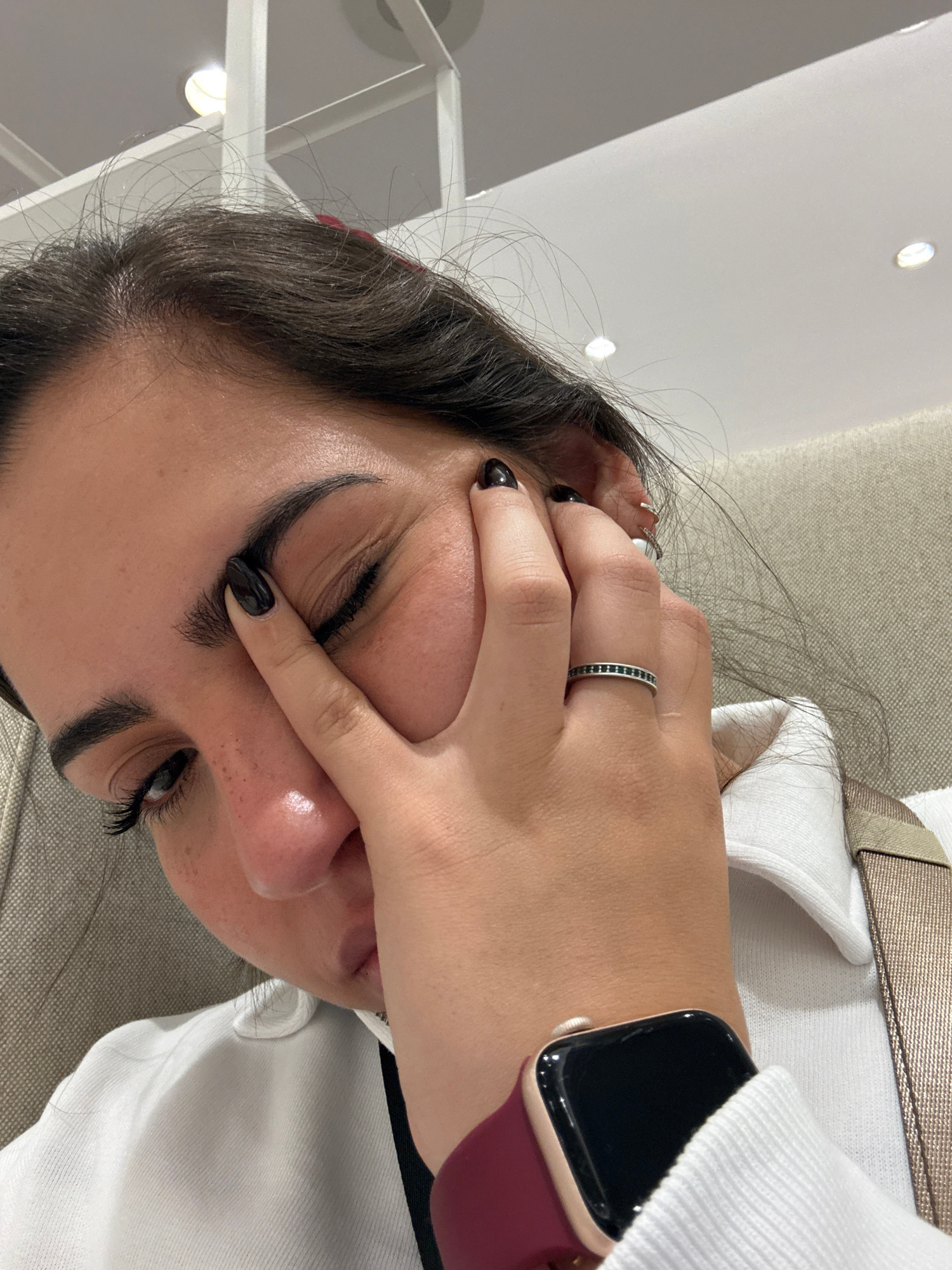 A close-up, angled shot shows a person obscuring their face with their hand. The person has dark hair and wears a silver ring with small, dark stones on their ring finger. The fingernails are painted…read more