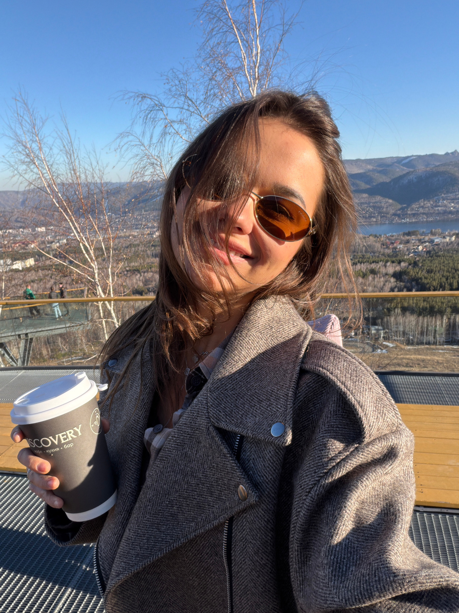 A young woman with shoulder-length brown hair, wearing sunglasses and a gray herringbone jacket, holds a gray-and-white paper coffee cup labeled "Discovery" in Russian and English. She is smiling at t…read more