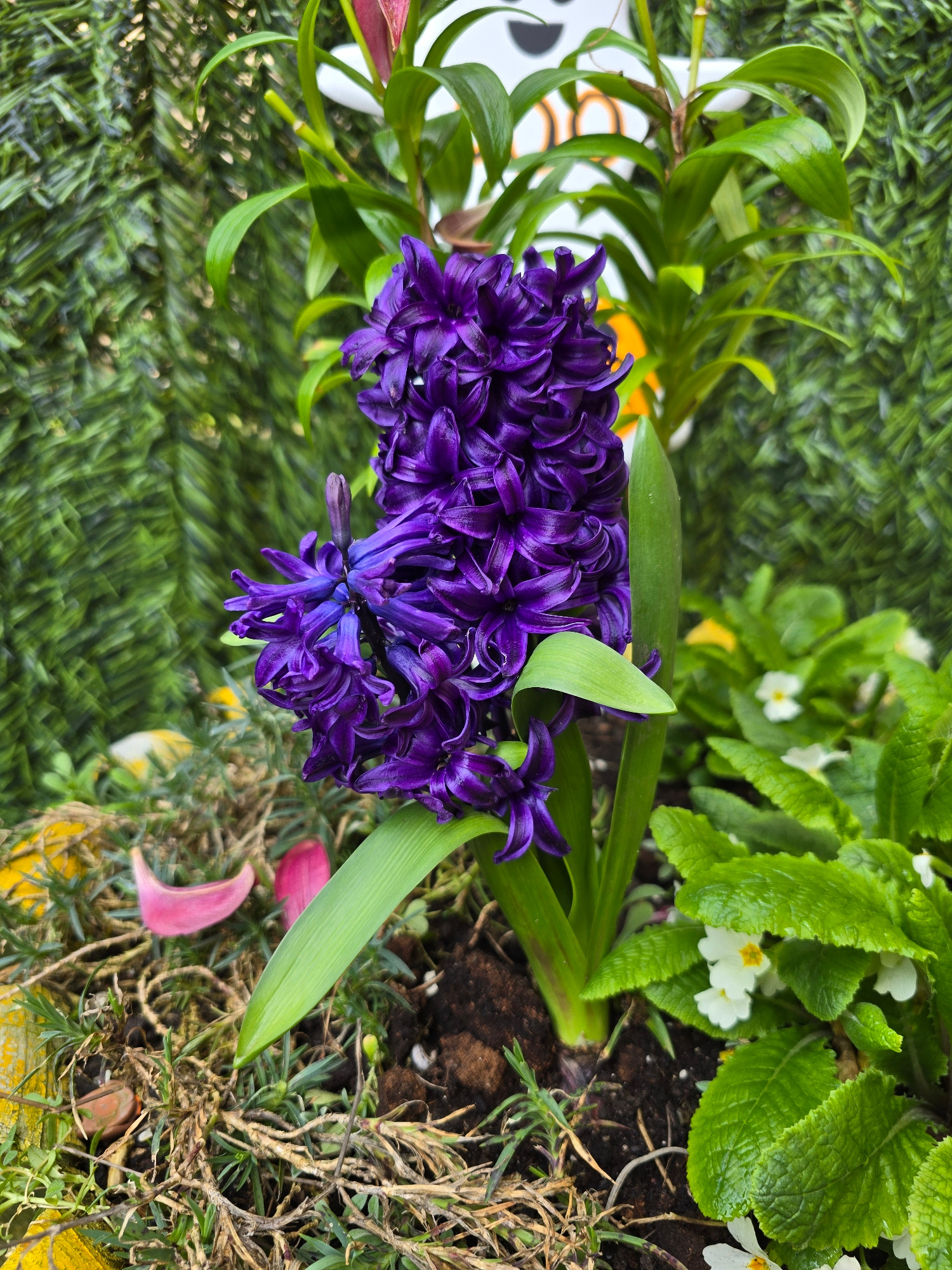 A top-down shot shows a vibrant purple hyacinth flower, with green leaves, centrally positioned. The flower is surrounded by other greenery, including some broad-leafed plants with small white flowers…read more