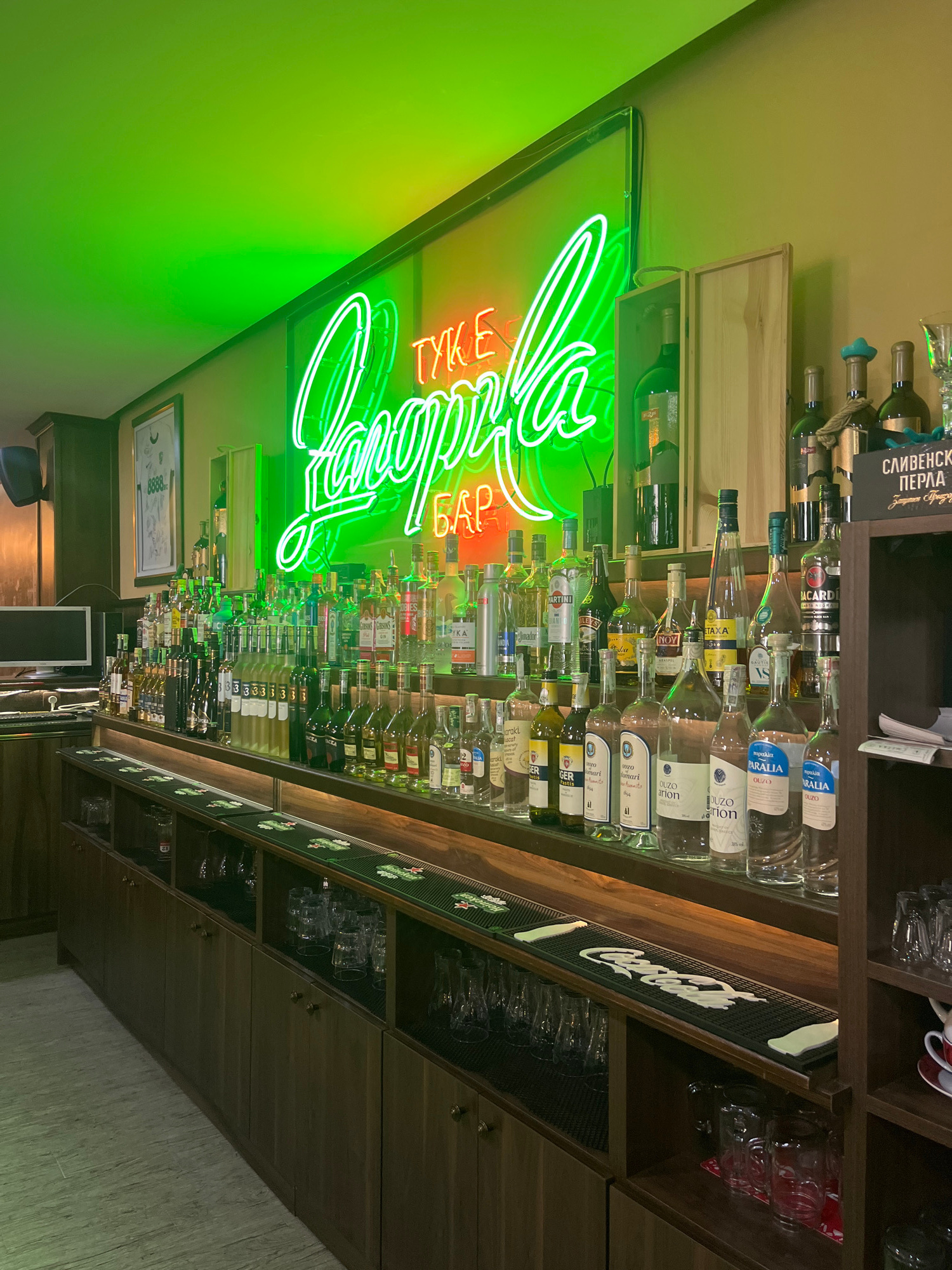 The image shows a bar called "People" in Stara Zagora, Bulgaria. A bright green neon sign displaying the bar's name hangs on the wall. Bottles of various alcoholic beverages are arranged on shelves be…read more