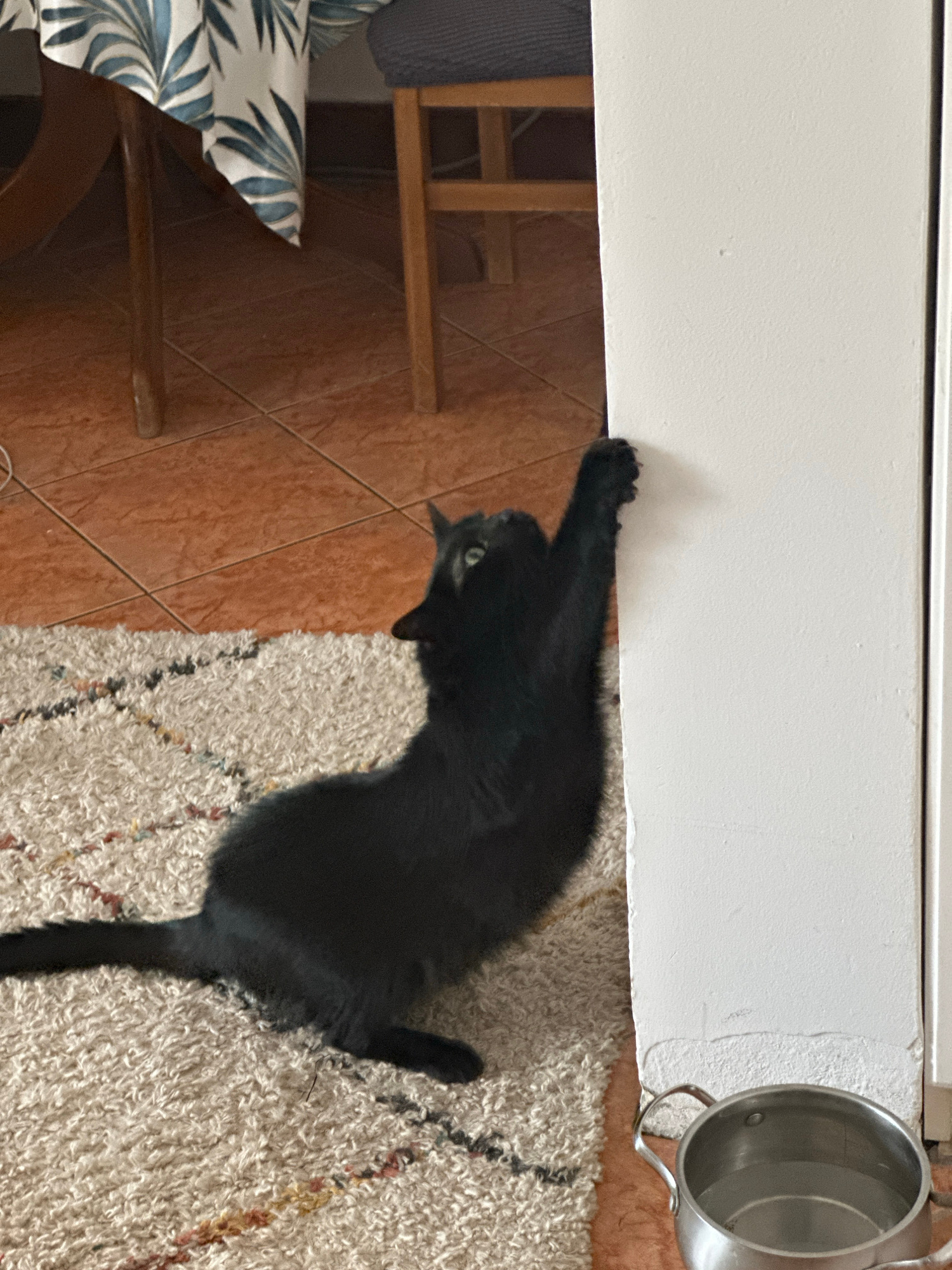 A black cat with green eyes stretches its front paws against a white wall. The cat lies on a tan rug with a geometric pattern. To the left, a chair with a blue and white patterned cushion is partially…read more