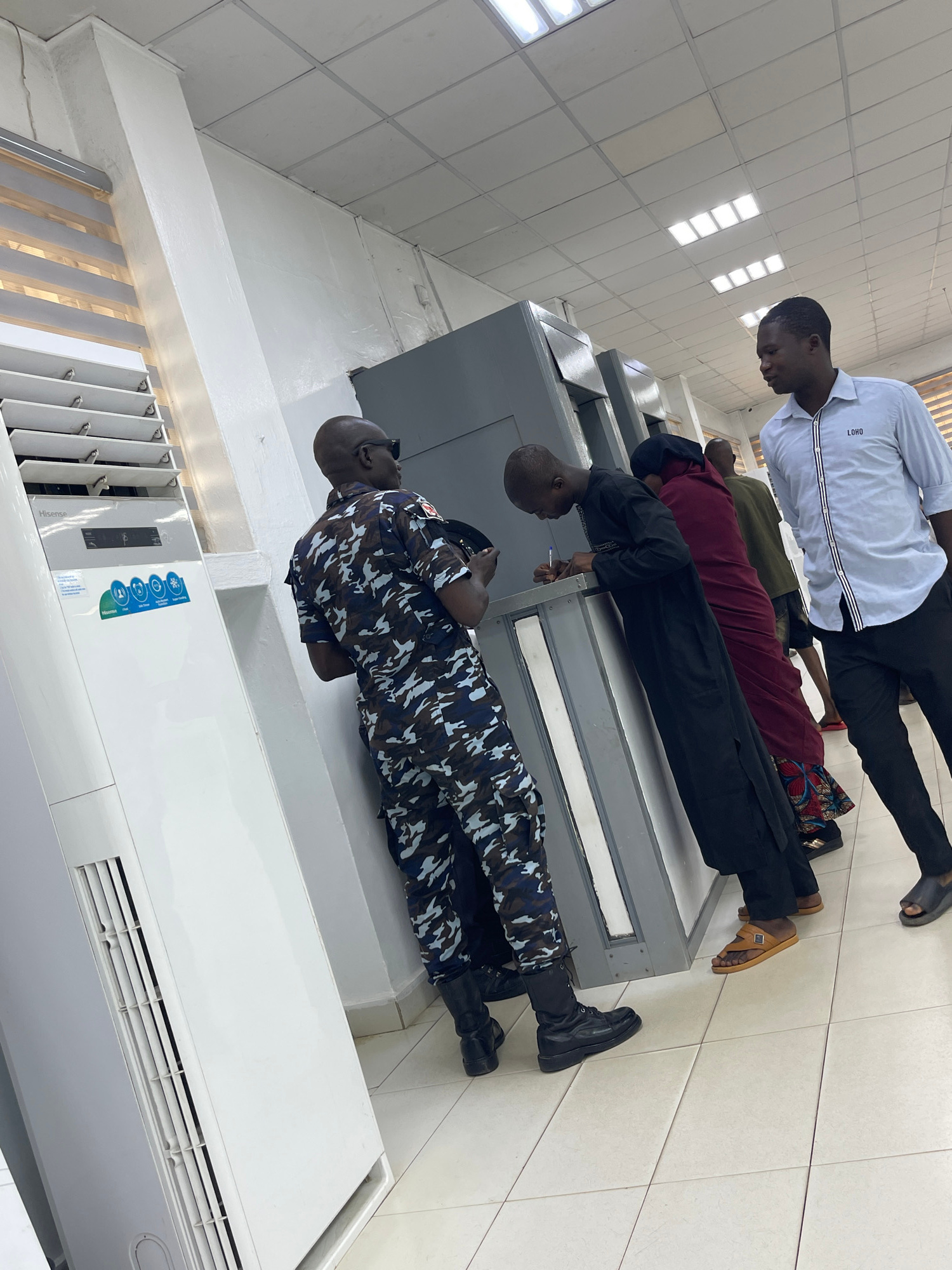 An indoor scene, likely a public building in Zaria, Nigeria, shows five individuals standing in what appears to be a queue or waiting line. The image is taken at an upward angle, with the individuals…read more