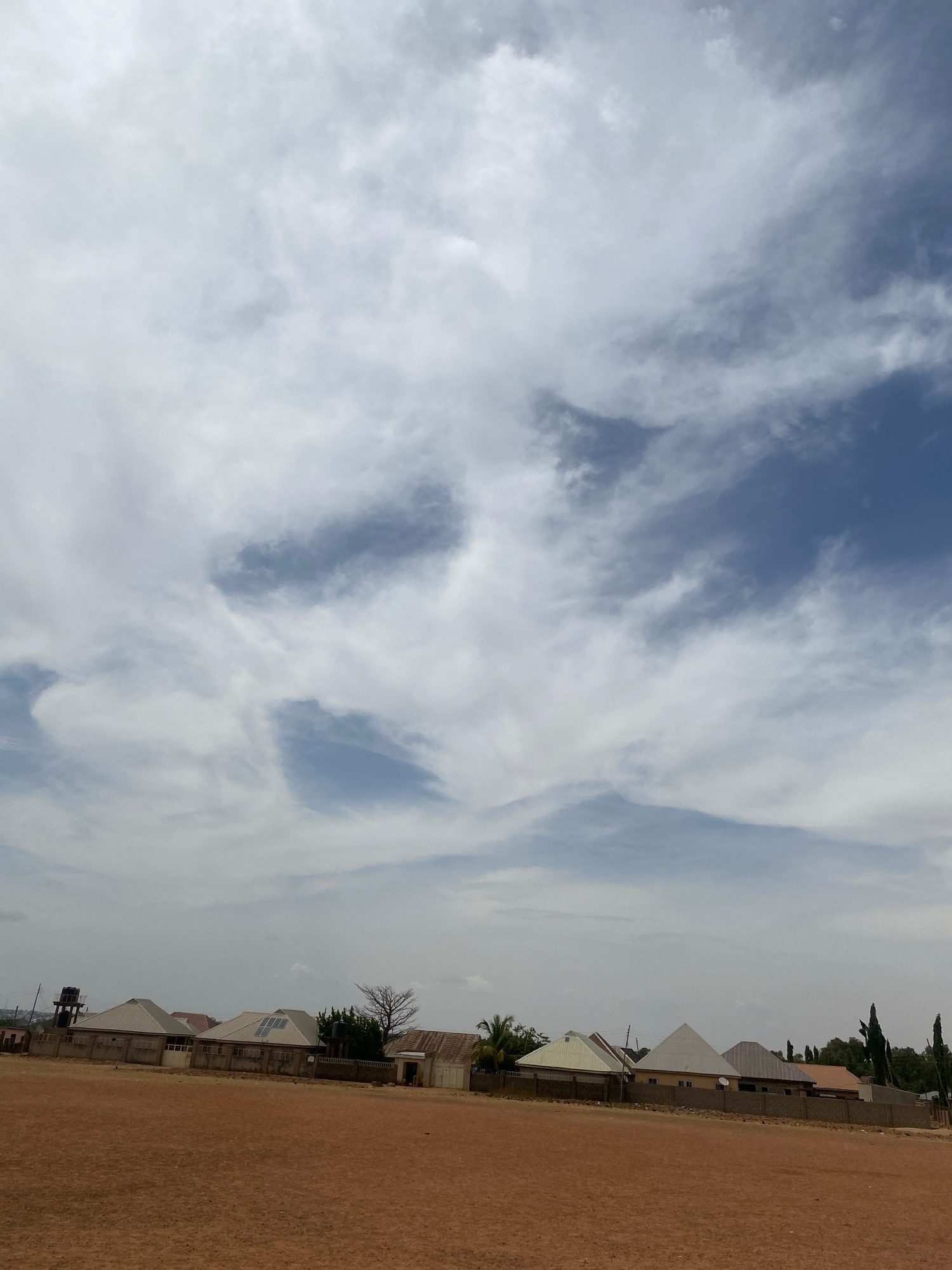 The image shows a view of the sky and part of a built environment in Rido, Nigeria. The sky is predominantly cloudy with patches of blue visible. Below the sky, a line of buildings with varying roof s…read more