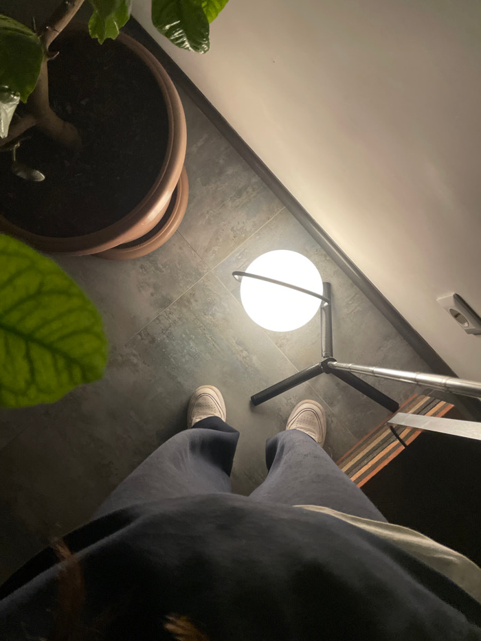 The image captures an overhead view of a room, focusing on a corner with various objects. The floor is covered with gray, rectangular tiles, some appearing lighter than others, suggesting a textured o…read more