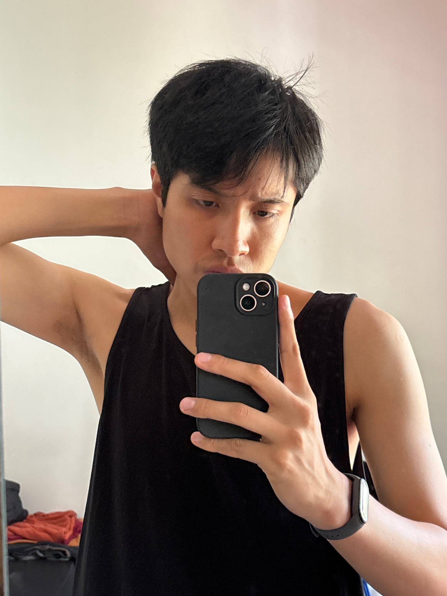 A person with dark hair and light skin is taking a selfie with a black smartphone. The person is wearing a black tank top and a black smartwatch on their left wrist. They are leaning on their left arm…read more