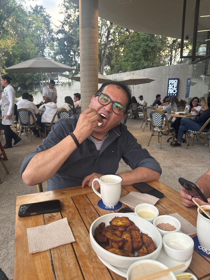 The image depicts an outdoor dining scene at Proscenio Cafe, located in Mexico City, Mexico. In the immediate foreground, a man with dark hair and black-rimmed glasses, wearing a dark blue long-sleeve…read more