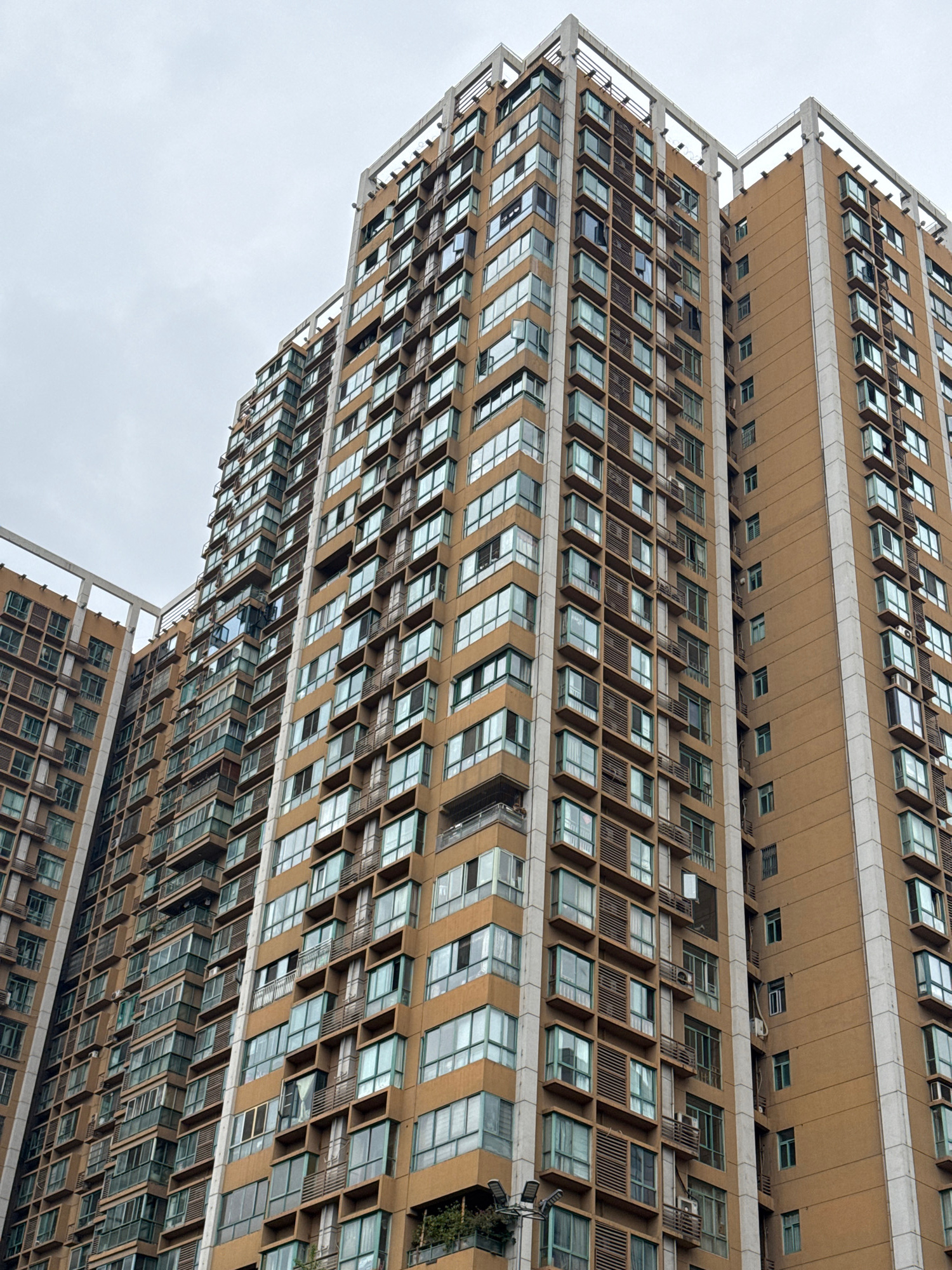 A low-angle view of a tall, brown apartment building in Jinjiang District, China. The building has many windows, most of which are open. The building appears to be residential. The sky is overcast.