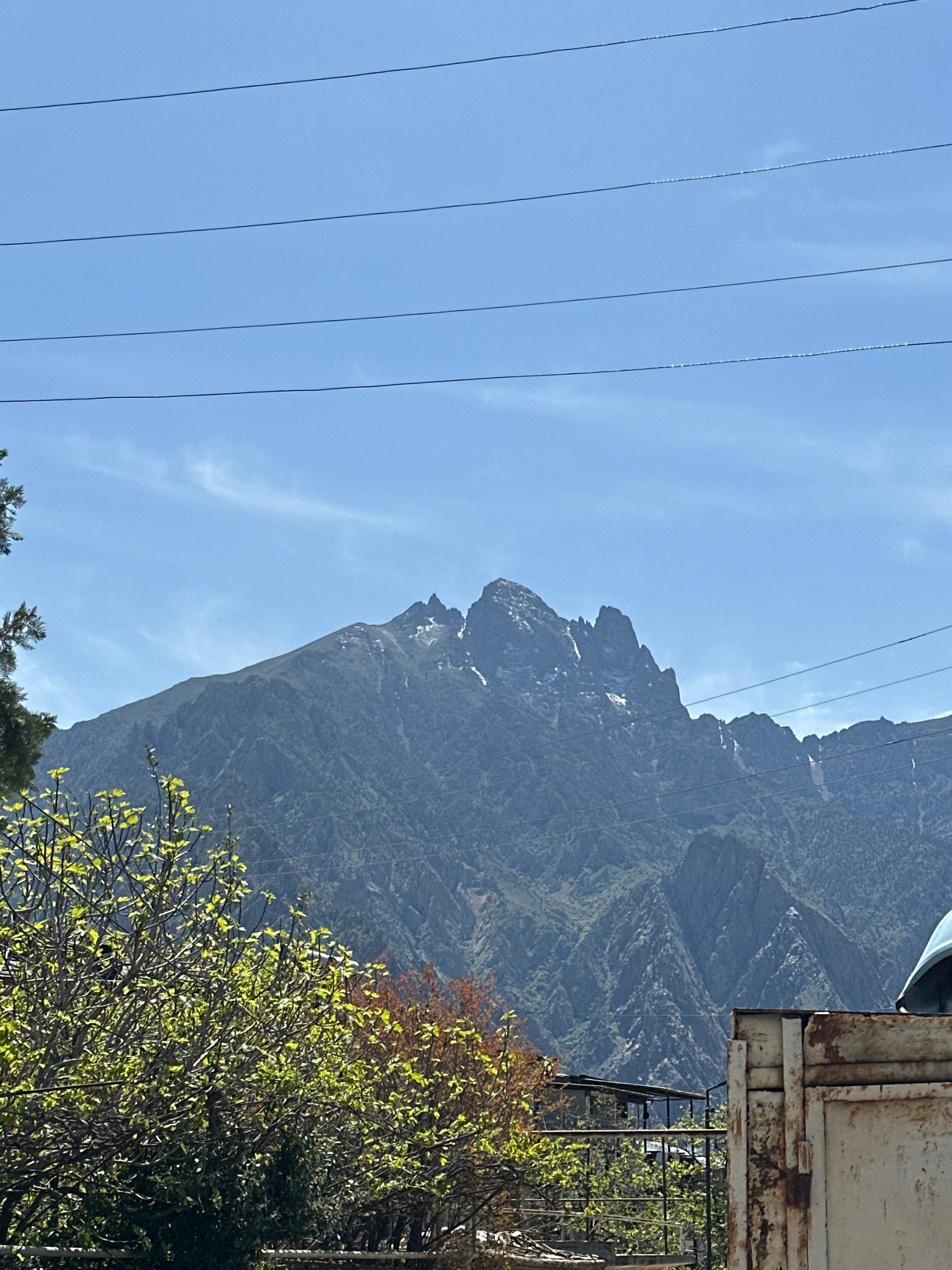 The image, captured in Agarak, Armenia, displays a grand mountainous vista under a clear blue sky. The scene is dominated by a majestic, rugged mountain range on the right, its steep, craggy peaks and…read more