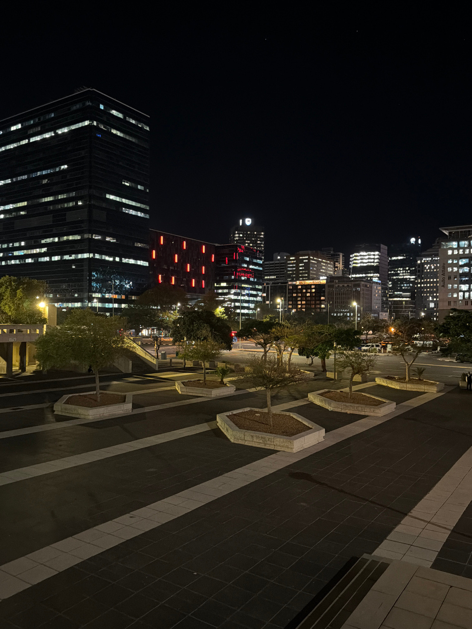 This nighttime photograph captures a view of the city of Cape Town, South Africa. The shot appears to be taken from an elevated vantage point, possibly a pedestrian walkway or balcony. The foreground…read more