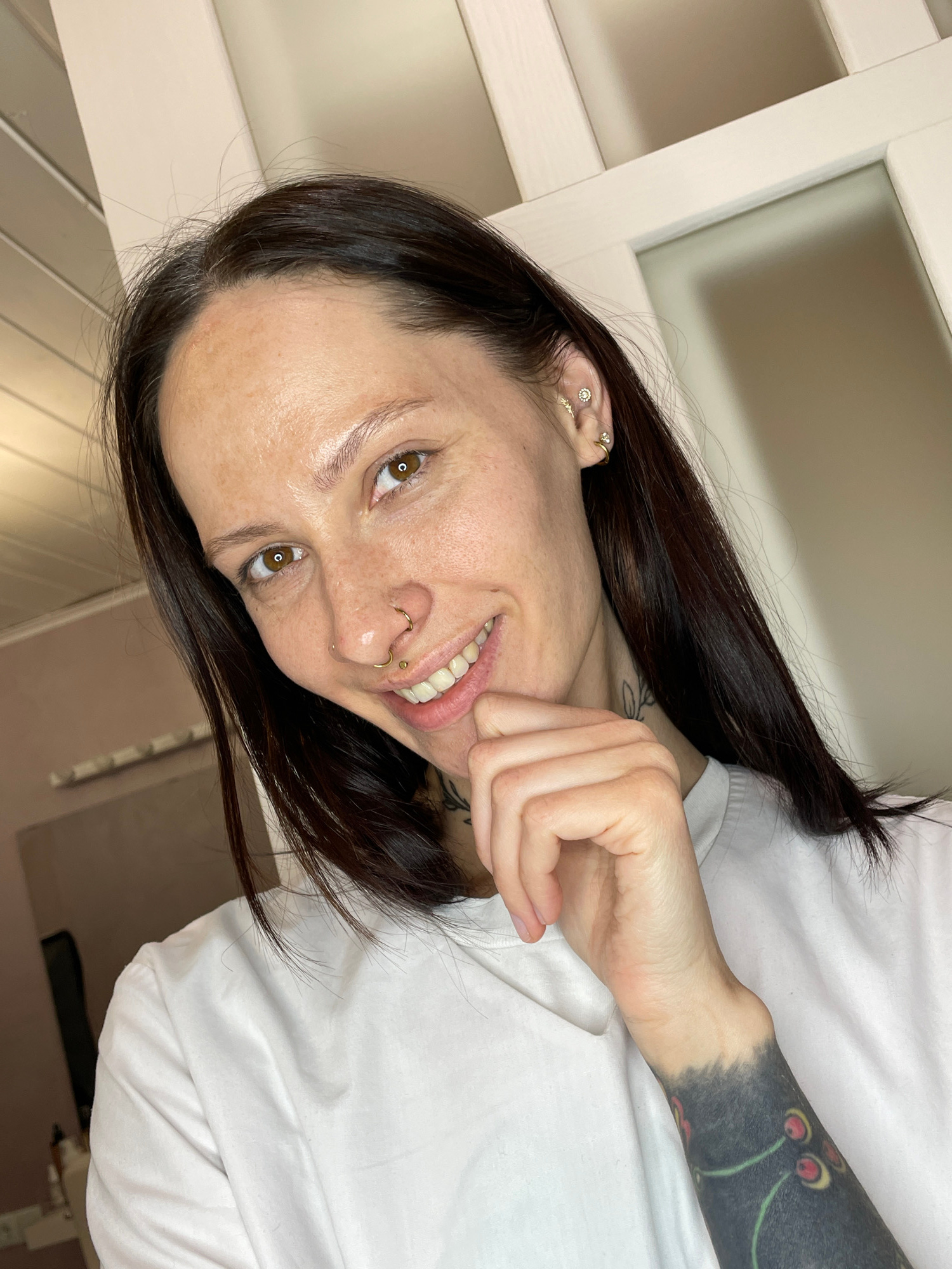 A woman with dark brown hair and multiple piercings in her ear and nose is smiling at the camera. She has tattoos on her left arm and neck. She is wearing a white t-shirt. The background includes a wh…read more