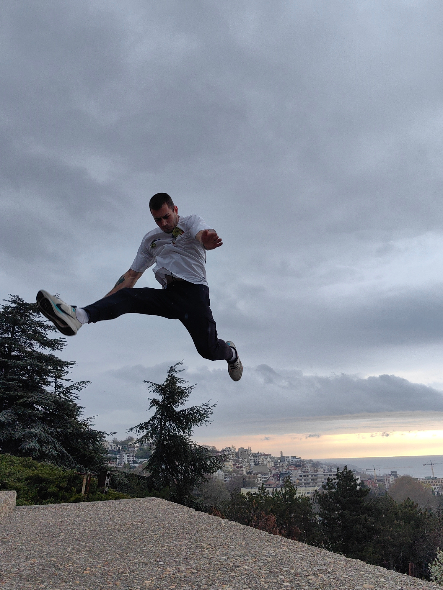 A man is captured mid-air in a dynamic jump, positioned against a backdrop of a cloudy sky. He is wearing a white t-shirt, dark pants, and sneakers. His body is angled, and limbs are outstretched. A t…read more