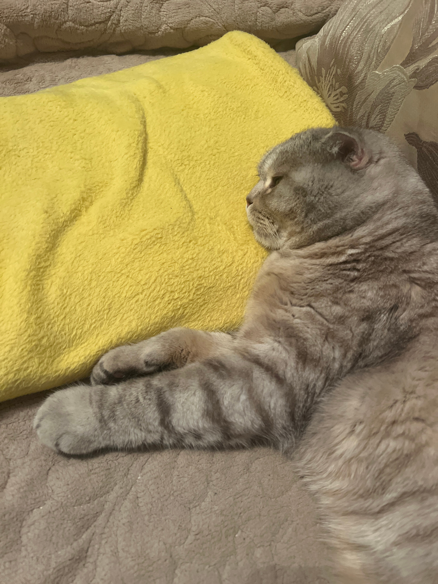 An overhead shot captures a domestic cat resting peacefully indoors. The cat, with soft grey and tan striped fur, is curled up on various soft furnishings. Its head is gently laid on a bright yellow,…read more
