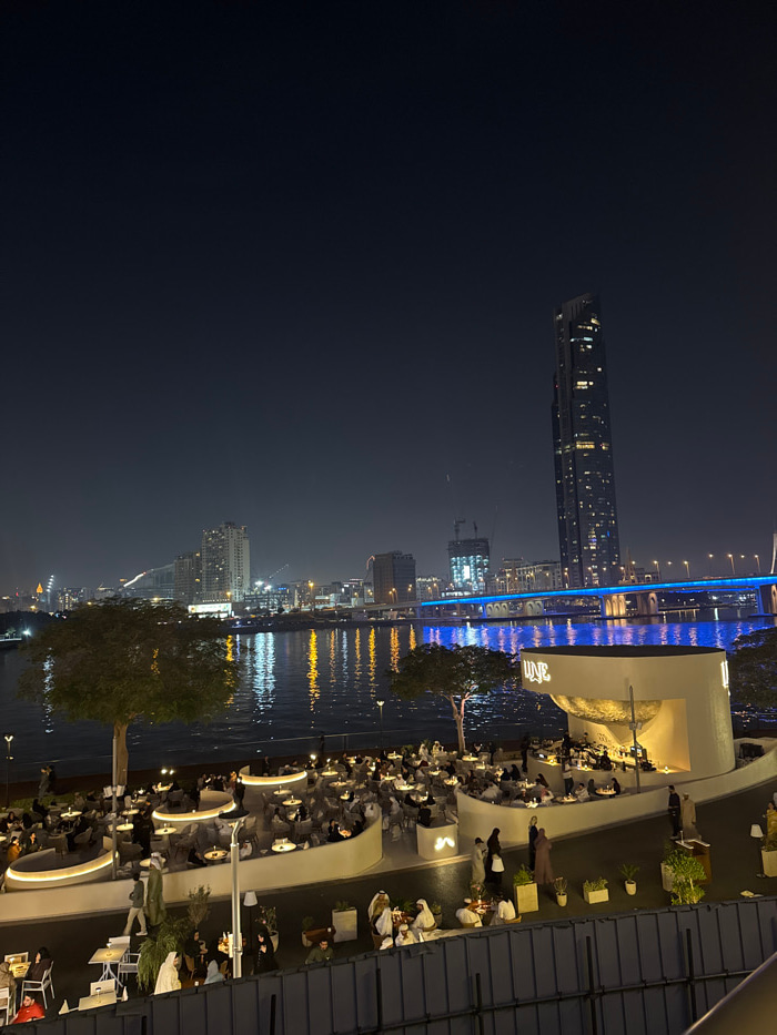 A night scene captures a city's edge with a blend of urban and social elements. A tall skyscraper pierces the dark sky, joined by other illuminated buildings. A body of water reflects the city lights,…read more