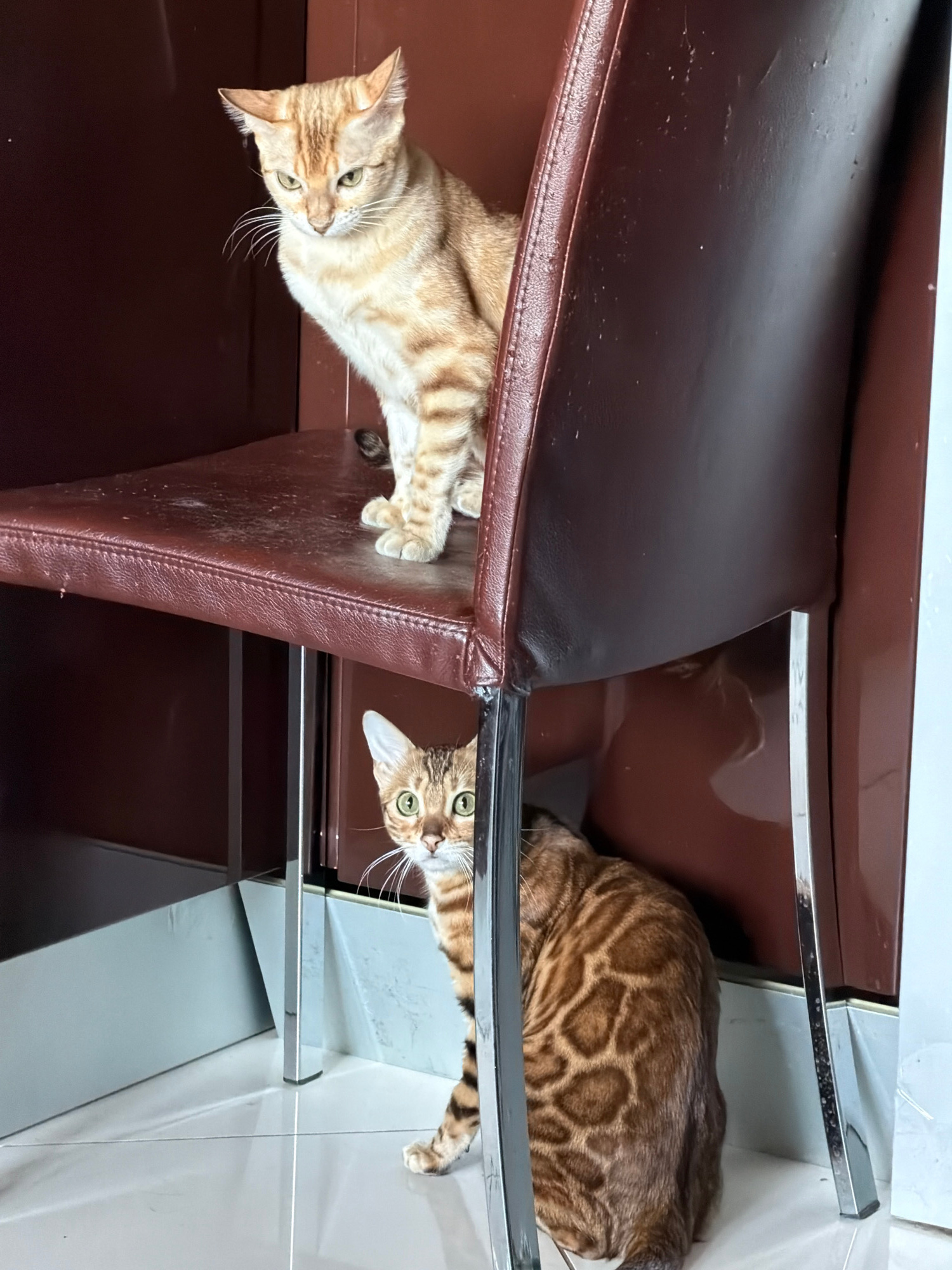 Two cats are beneath a brown chair with metal legs and arms. One cat is light orange with stripes, and the other is a Bengal cat with brown spots. The setting includes a tiled floor and brown cabinets…read more