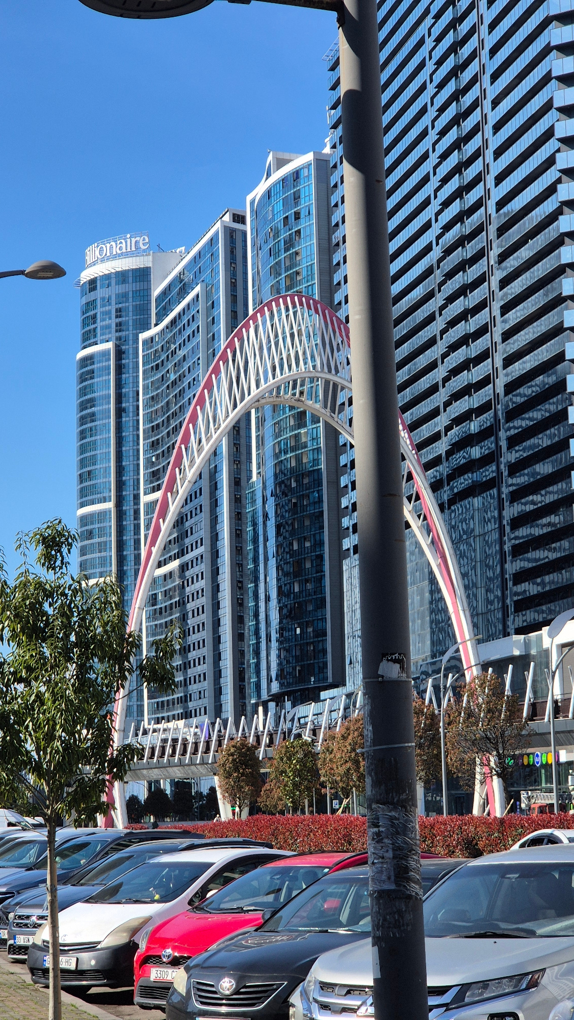 The image shows a cityscape in Batumi, Georgia, notable for its modern architecture. The "Billionaire" residential complex stands tall, reflecting the clear blue sky in its glass facade. A pedestrian…read more