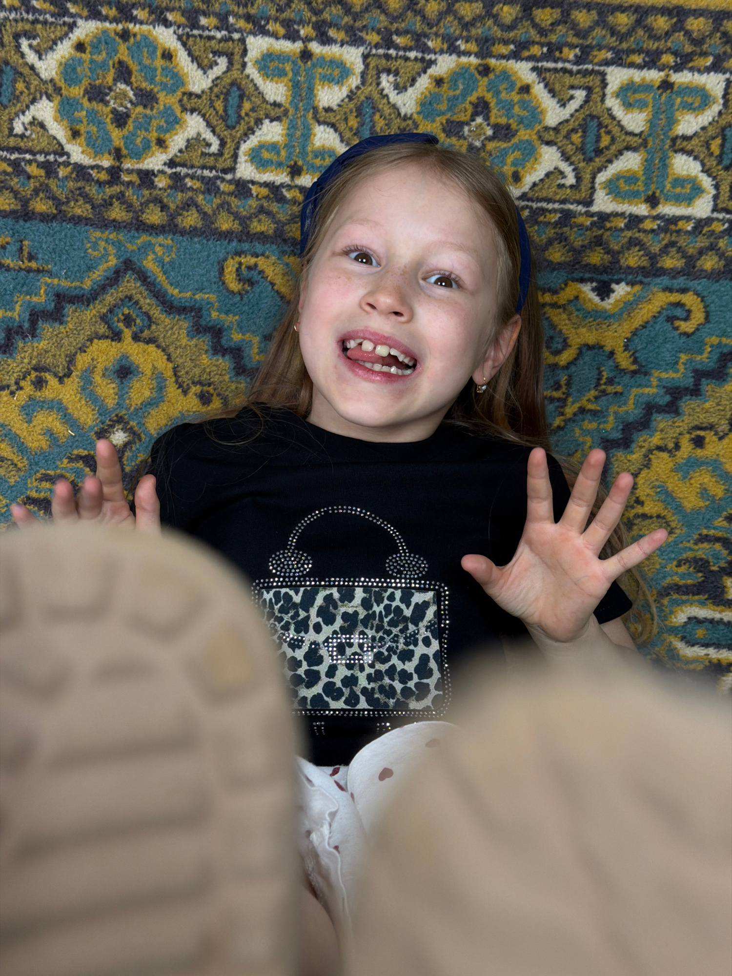A girl with fair skin and light brown hair, wearing a blue headband and a black shirt with a rhinestone-studded leopard print design, is lying on a patterned rug. She is smiling, showing her teeth, an…read more