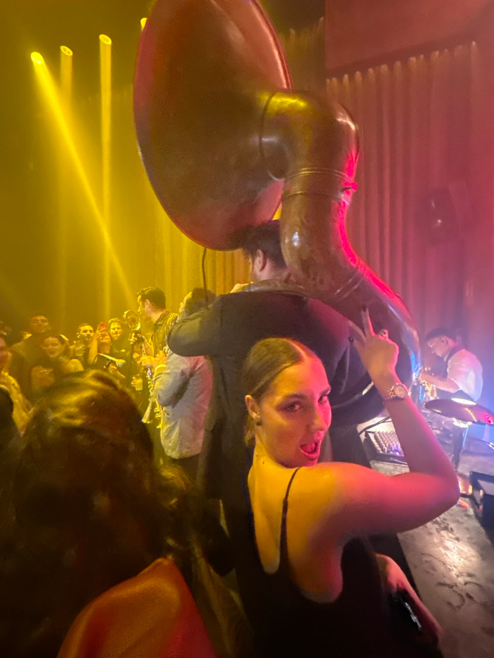 A woman with dark hair and a black top poses while sticking out her tongue. She wears a watch on her left wrist and is next to a large tuba. A group of people can be seen behind her, illuminated by ye…read more