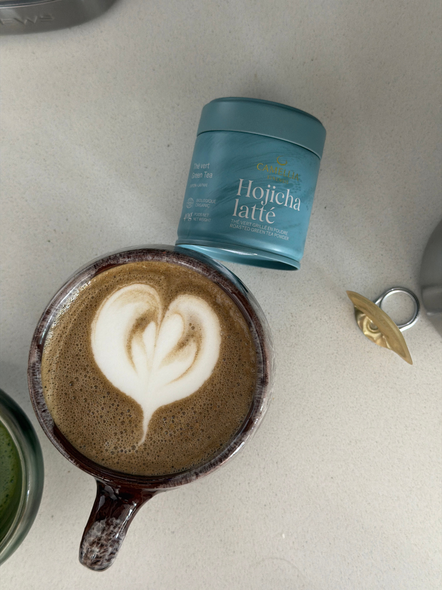 A top-down shot features a light-colored countertop displaying a can of "Camellia Sinensis Hojicha Latte," a ceramic mug filled with a latte with a milk foam heart design, a small gold-colored metal c…read more