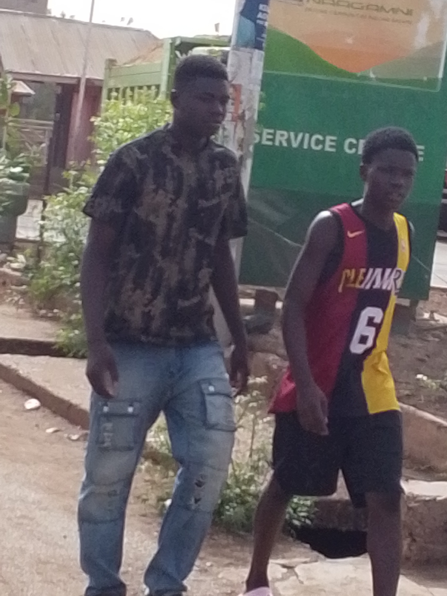 Two young men are walking down an unpaved, residential street. The man on the left is wearing a dark camouflage-patterned t-shirt and light blue jeans with cargo pockets. The man on the right is weariβ¦read more