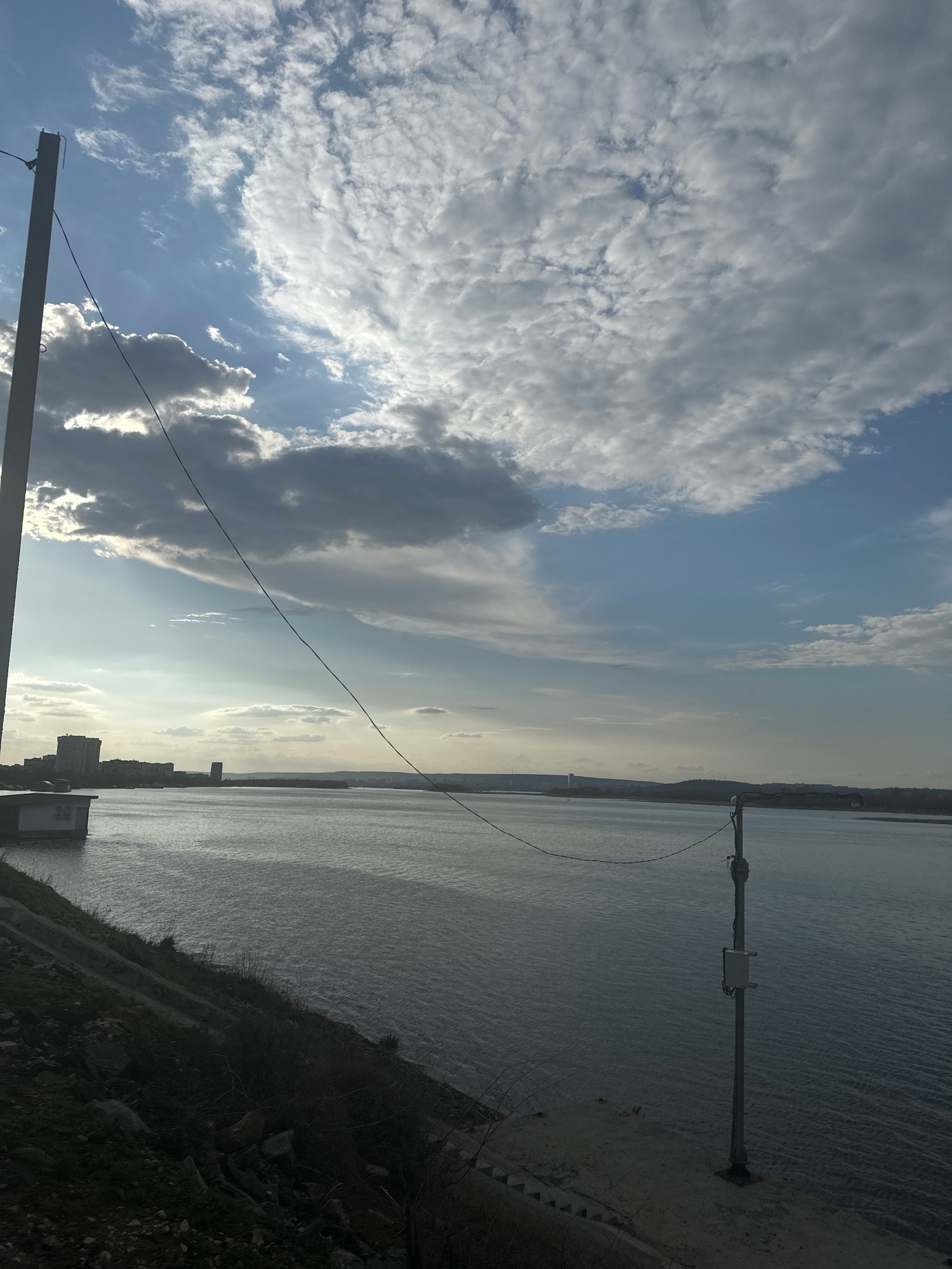 The image shows a landscape with a body of water on the right side, possibly a river or lake. The water is gray and reflects the sky. On the right, there's a shoreline with some vegetation. In the dis…read more