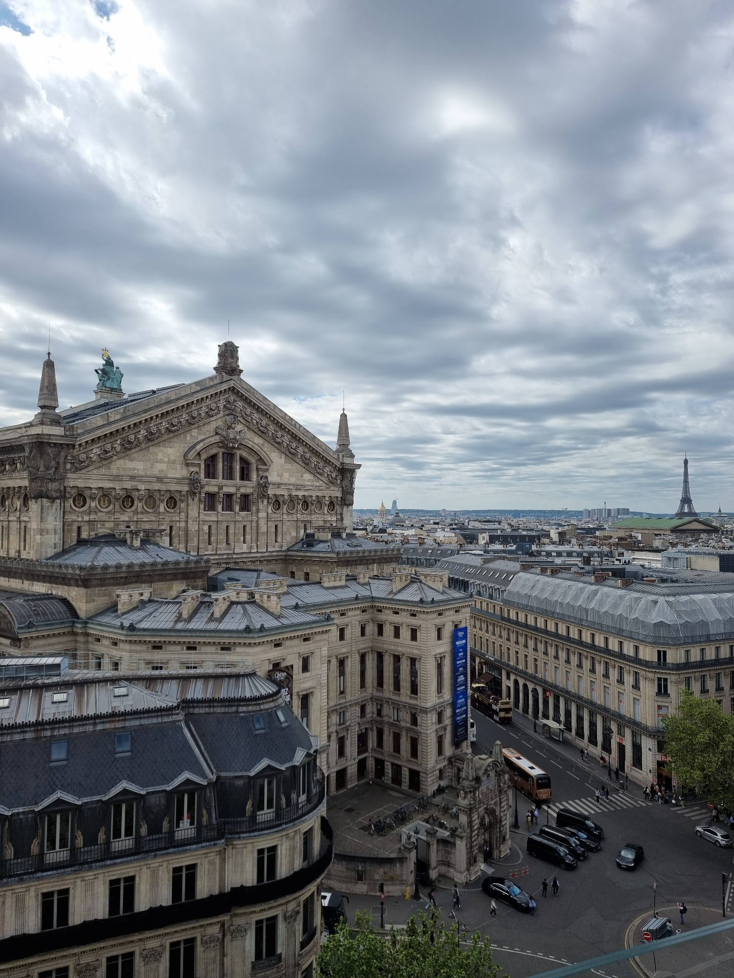 The image depicts a view over Paris, France, with a prominent ornate building complex in the foreground. In the background, the Eiffel Tower is visible amidst a cloudy sky. Various Parisian streets ar…read more