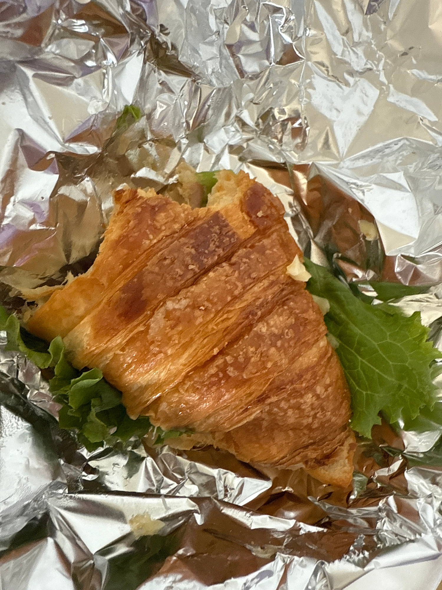 A croissant sandwich rests on aluminum foil. The sandwich contains lettuce. The location is Puebla, Mexico.