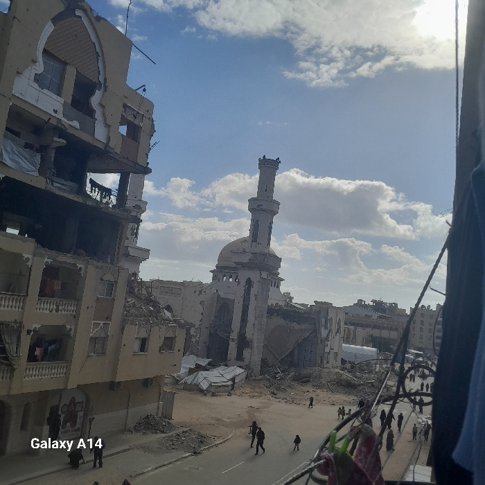 Amidst a blue sky dotted with white clouds, a scene of destruction unfolds. Buildings are heavily damaged, reduced to ruins. A prominent mosque with a tall minaret stands amidst the wreckage. A road s…read more