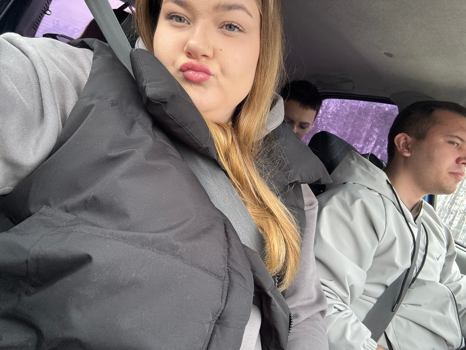 The image depicts three individuals inside a vehicle. Two are visible in the front seats: a woman with blond hair and a black puffer jacket, and a man wearing a light grey jacket. Both are wearing sea…read more
