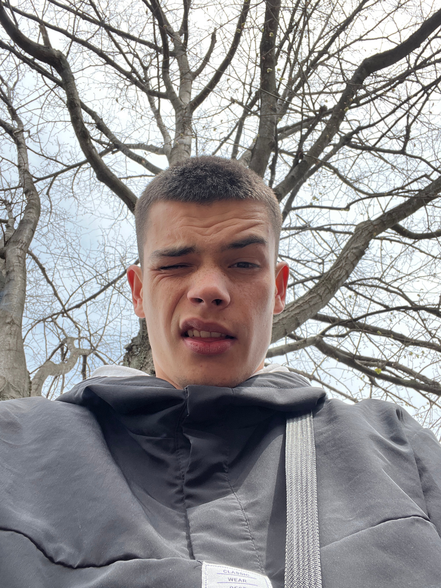A man is photographed from a low angle against a backdrop of bare tree branches and a cloudy sky. He is wearing a dark, puffy jacket with a gray strap visible on the shoulder. The jacket has a tag wit…read more