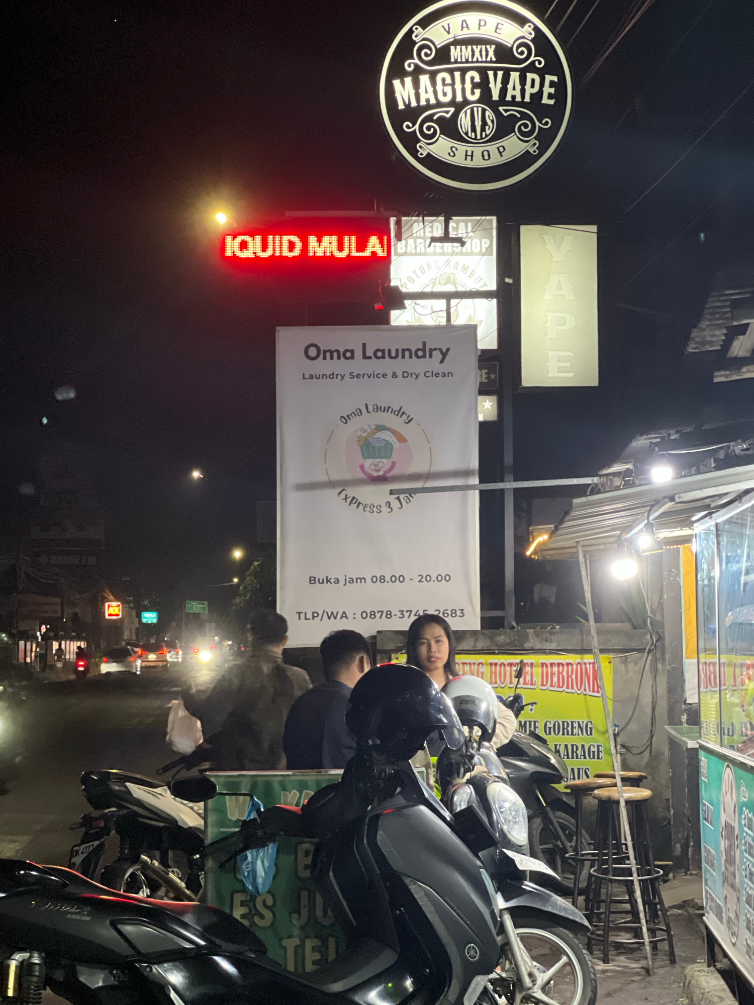 Captured at night in Sukawati, Indonesia, the image features street-side businesses and passersby. Dominating the left side is a neon sign reading "IQUID MULAI" above the "Oma Laundry" banner, adverti…read more