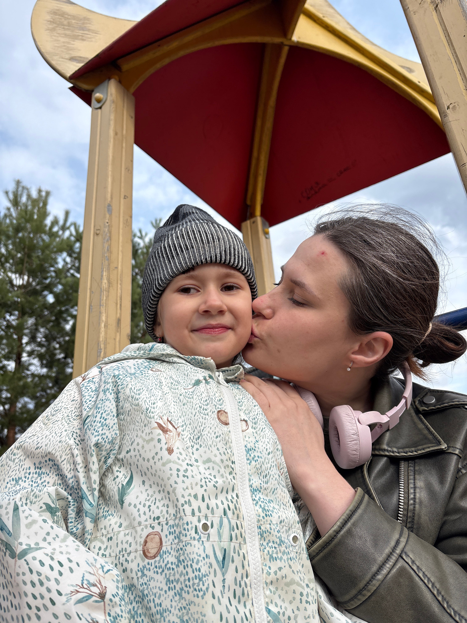 The image captures an affectionate moment between a woman and a young child, tilted on its side, likely taken from a low angle outdoors in Chaikovsky, Russia. The background features a cloudy sky and…read more