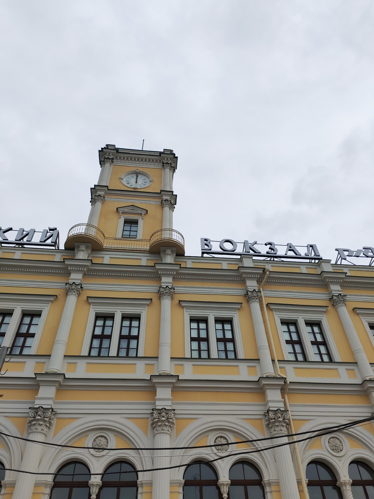 The image presents a low-angle, upward view of a grand, ornate building under an overcast sky. The structure is predominantly light yellow with extensive white architectural detailing. A prominent sq…read more