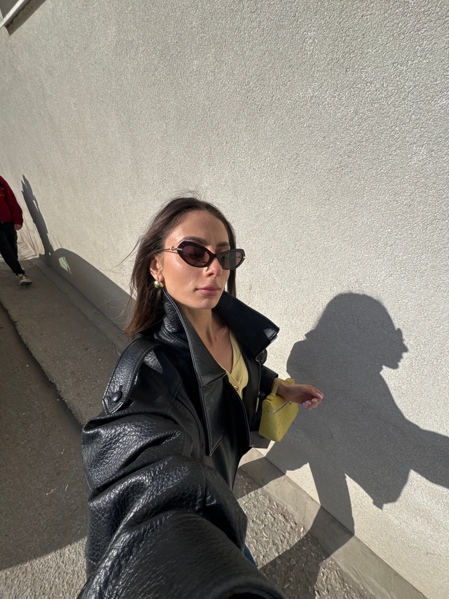 The image displays a woman posing outdoors under bright sunlight, captured from a low angle, seemingly looking towards the camera. She occupies the lower right portion of the frame, wearing a black le…read more