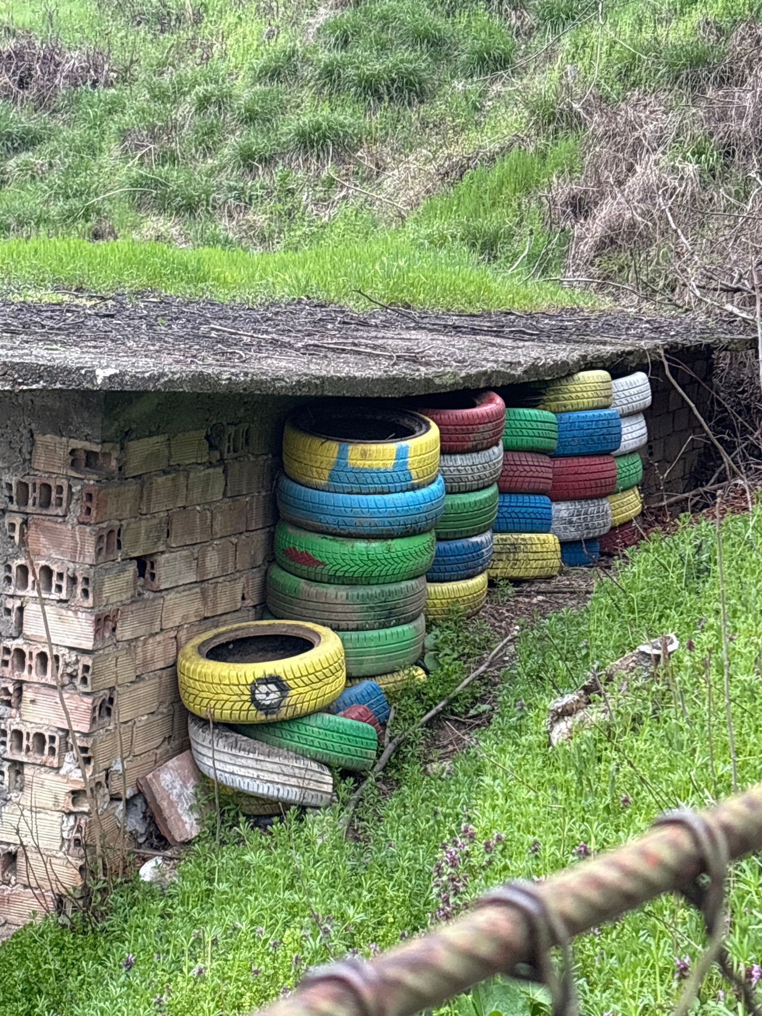A partially collapsed brick structure serves as a base for a collection of painted tires. The tires ascend in a stepped fashion, forming a makeshift staircase or decorative feature. The tires are pain…read more