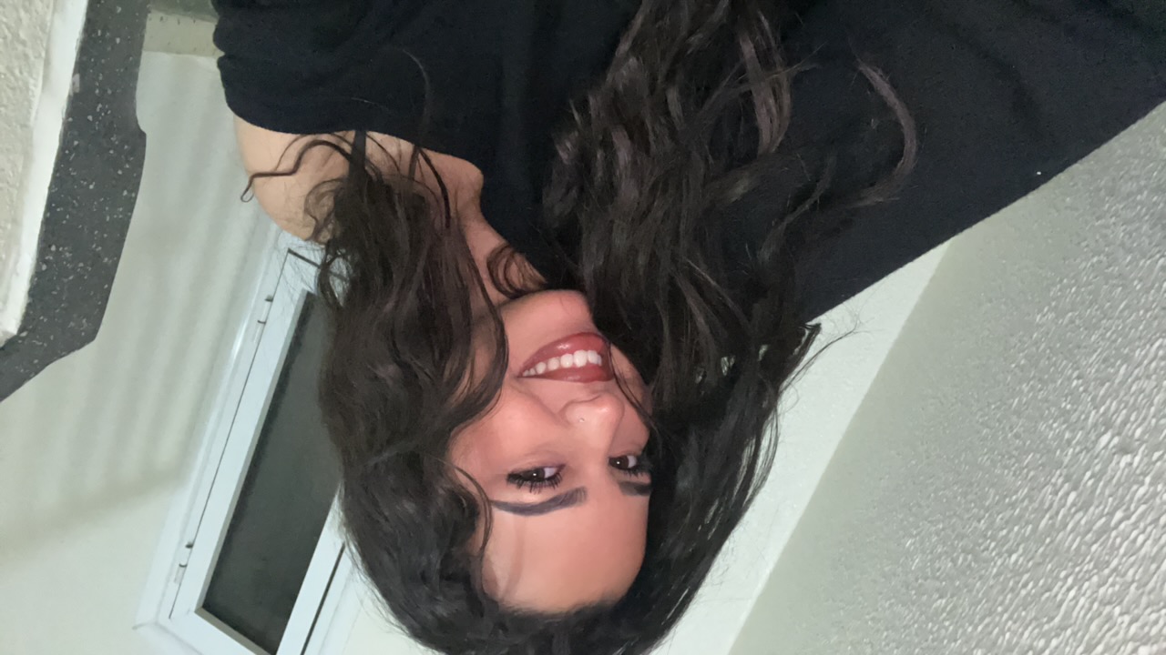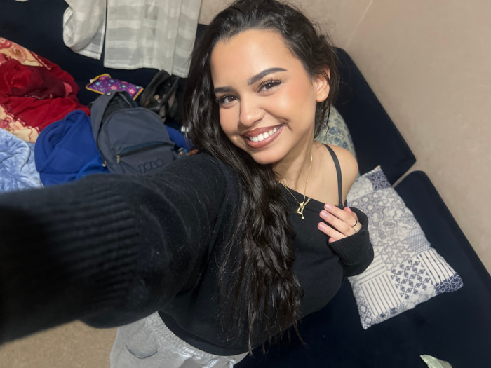 A woman smiles into the camera while laying on a dark blue sofa with a patterned pillow. She wears a black top, gold necklace, and a wedding ring. A dark bag with "POLO" on it and a patterned phone ca…read more