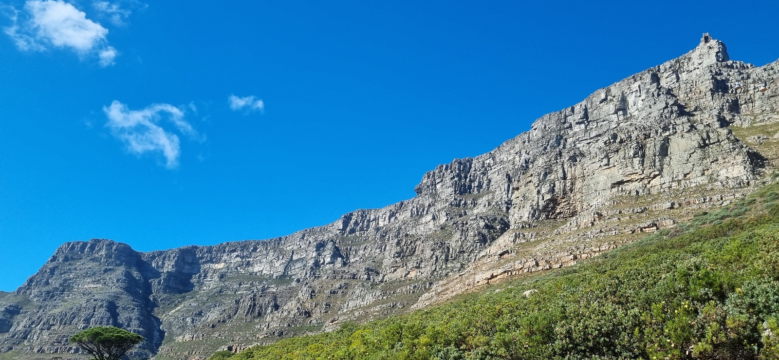 The image captures a view of Table Mountain in Cape Town, South Africa, under a clear blue sky with a few scattered clouds. The mountain's rocky facade dominates the frame, with layers of gray rock ex…read more