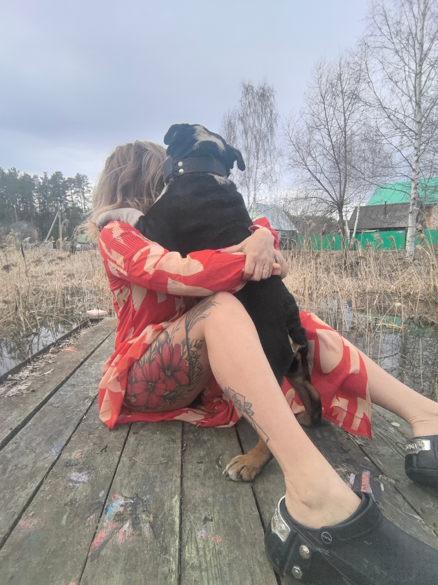 A person is seated on a wooden dock, embracing a black dog. The person is wearing a red and white patterned dress and black clogs. A large floral tattoo is visible on the person's thigh. The dog is we…read more