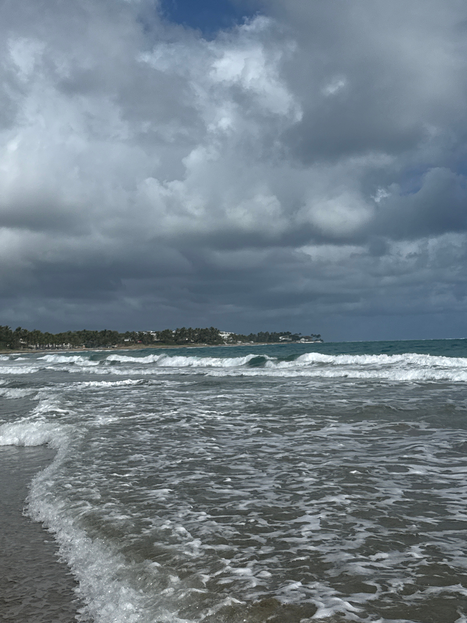 The image depicts a beach scene in Cabarete, Dominican Republic. The foreground is dominated by the ocean, with waves crashing on the shore. The water is a mix of blues and grays, reflecting the overc…read more